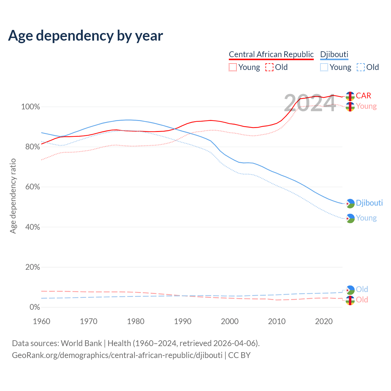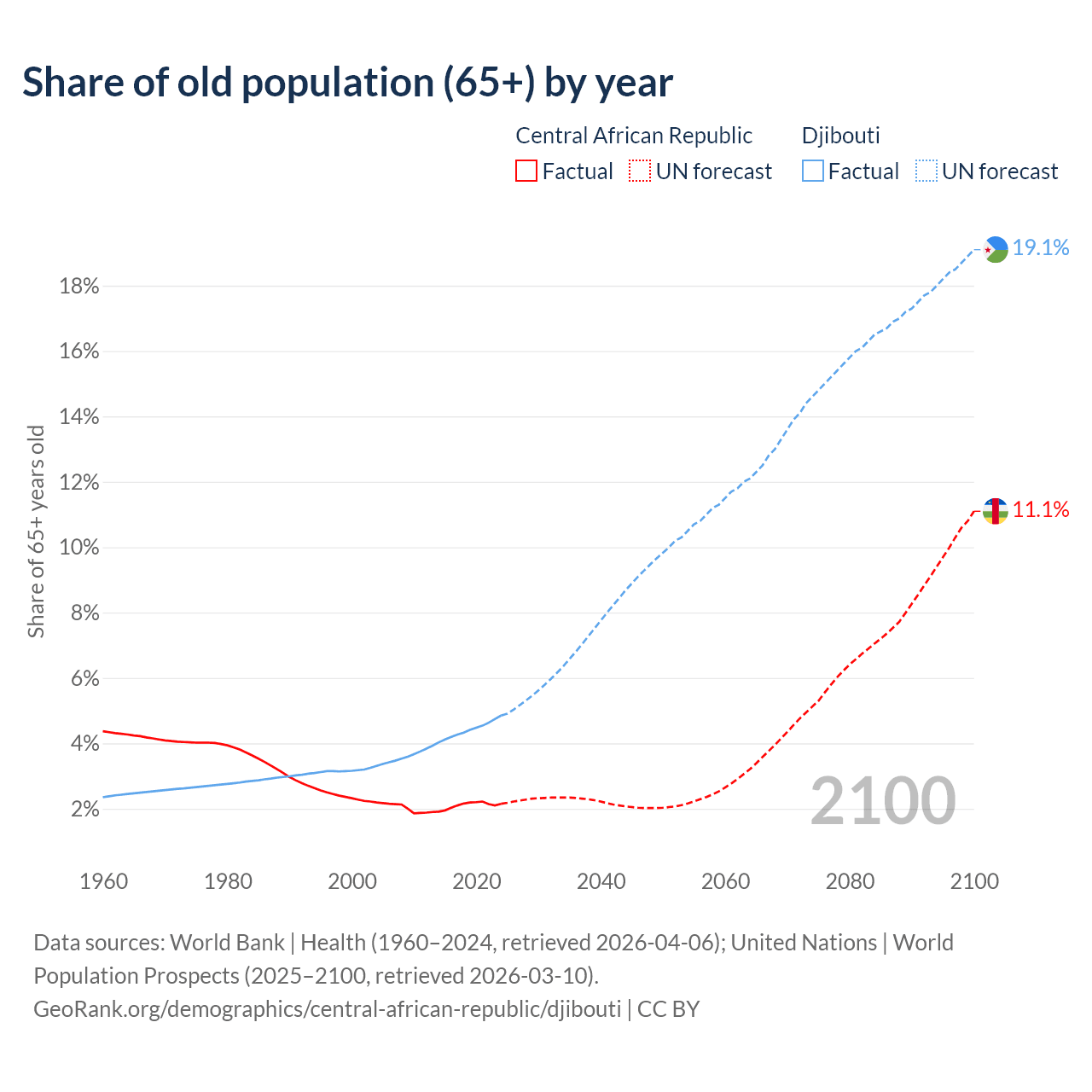 - The share of old-age demographic (65+) in the Central African Republic is 2.15% vs 4.85% in Djibouti.
