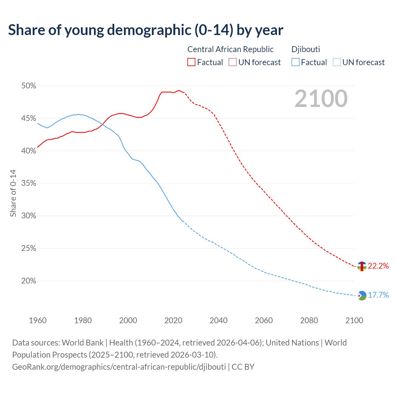 - The share of young demographic (0-15 years old) in the Central African Republic is 49% vs 29.2% in Djibouti.