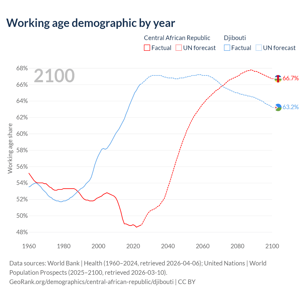- The Central African Republic has 2.81M working age adults (aged 15-64) vs 794K in Djibouti.