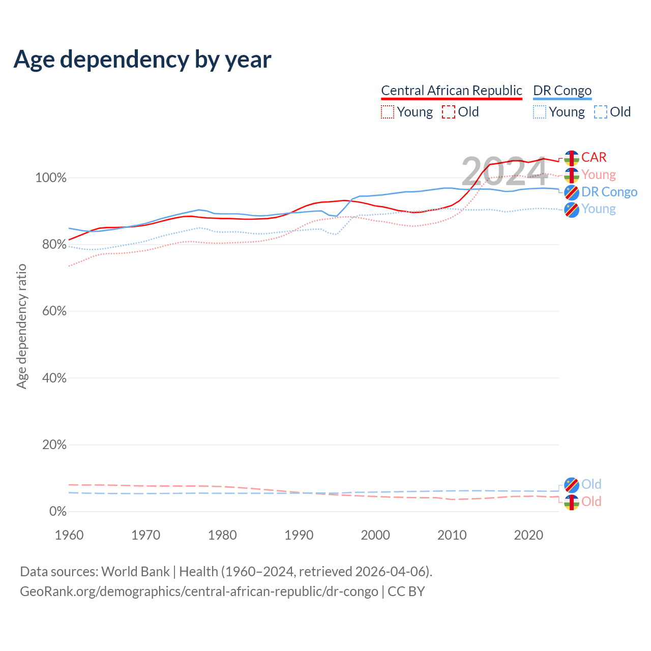 - The Central African Republic is ranked 196/196 by median age (oldest to youngest) vs 191/196 for the DR Congo.