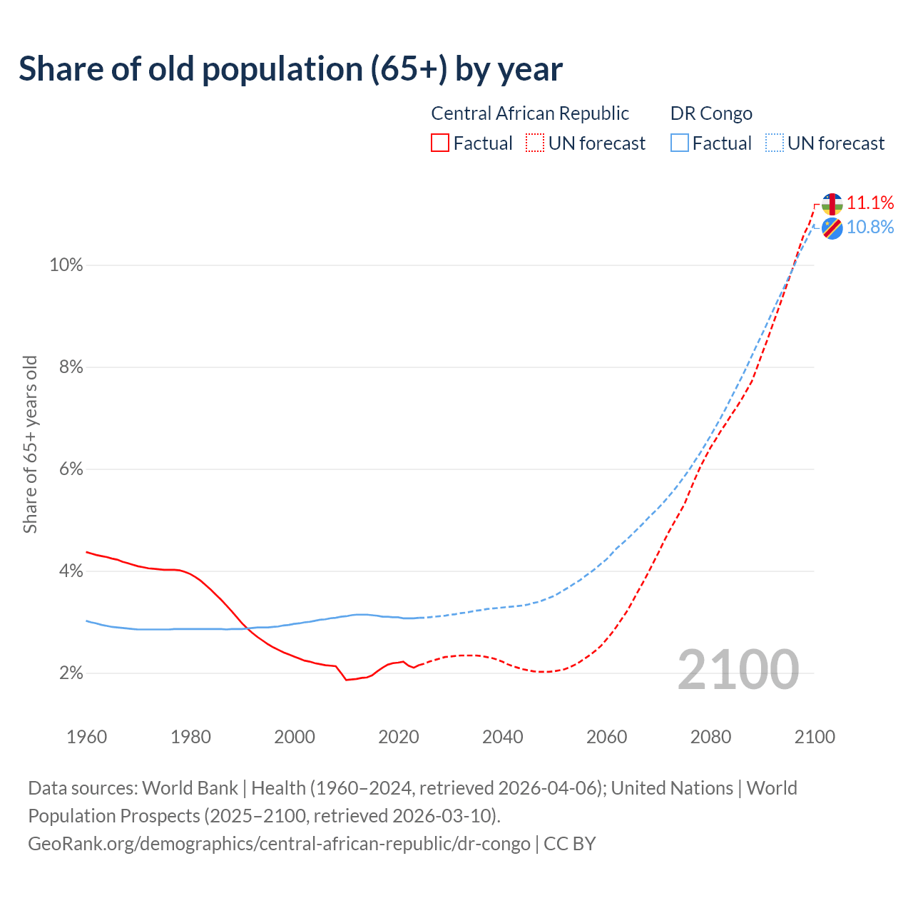 The share of older people aged 65 and over is 2.15% in the Central African Republic and 3.08% in the DR Congo. Life expectancy in the Central African Republic compared to the DR Congo .