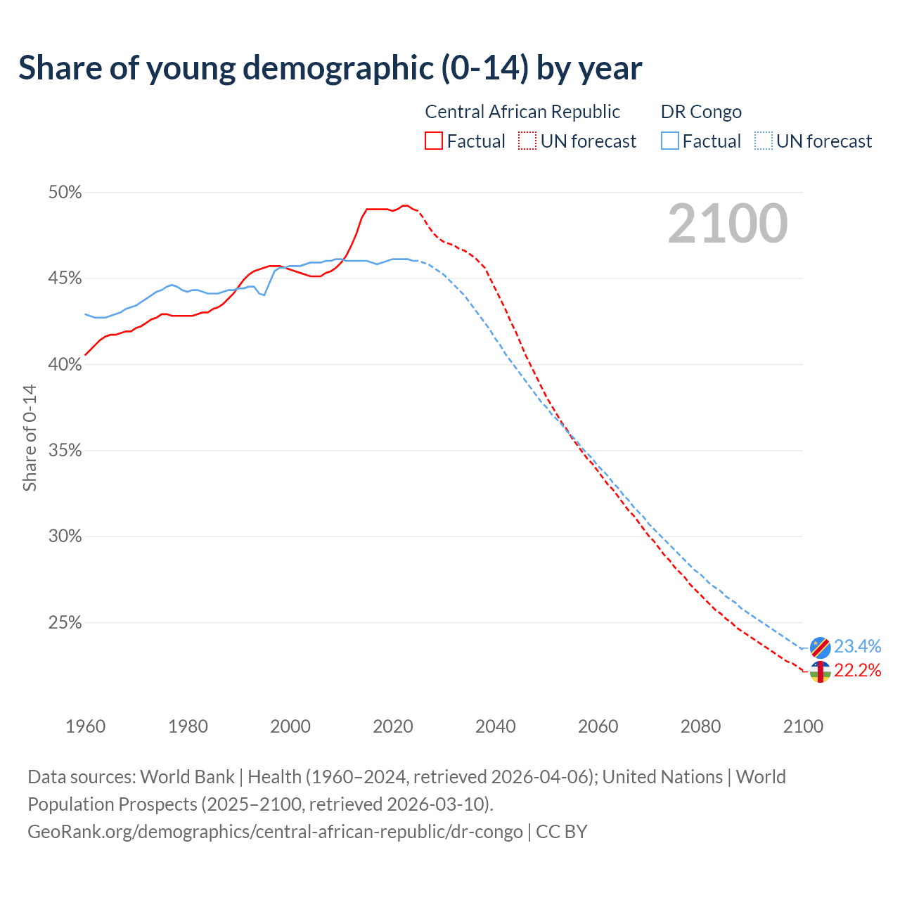 - The share of young demographic (0-15 years old) in the Central African Republic is 49% vs 46% in the DR Congo.