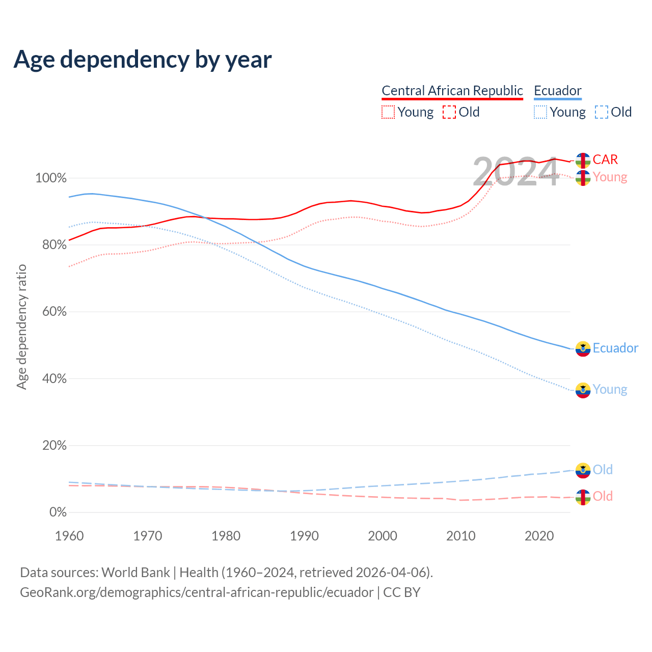 - The share of old-age demographic (65+) in the Central African Republic is 2.15% vs 8.34% in Ecuador.