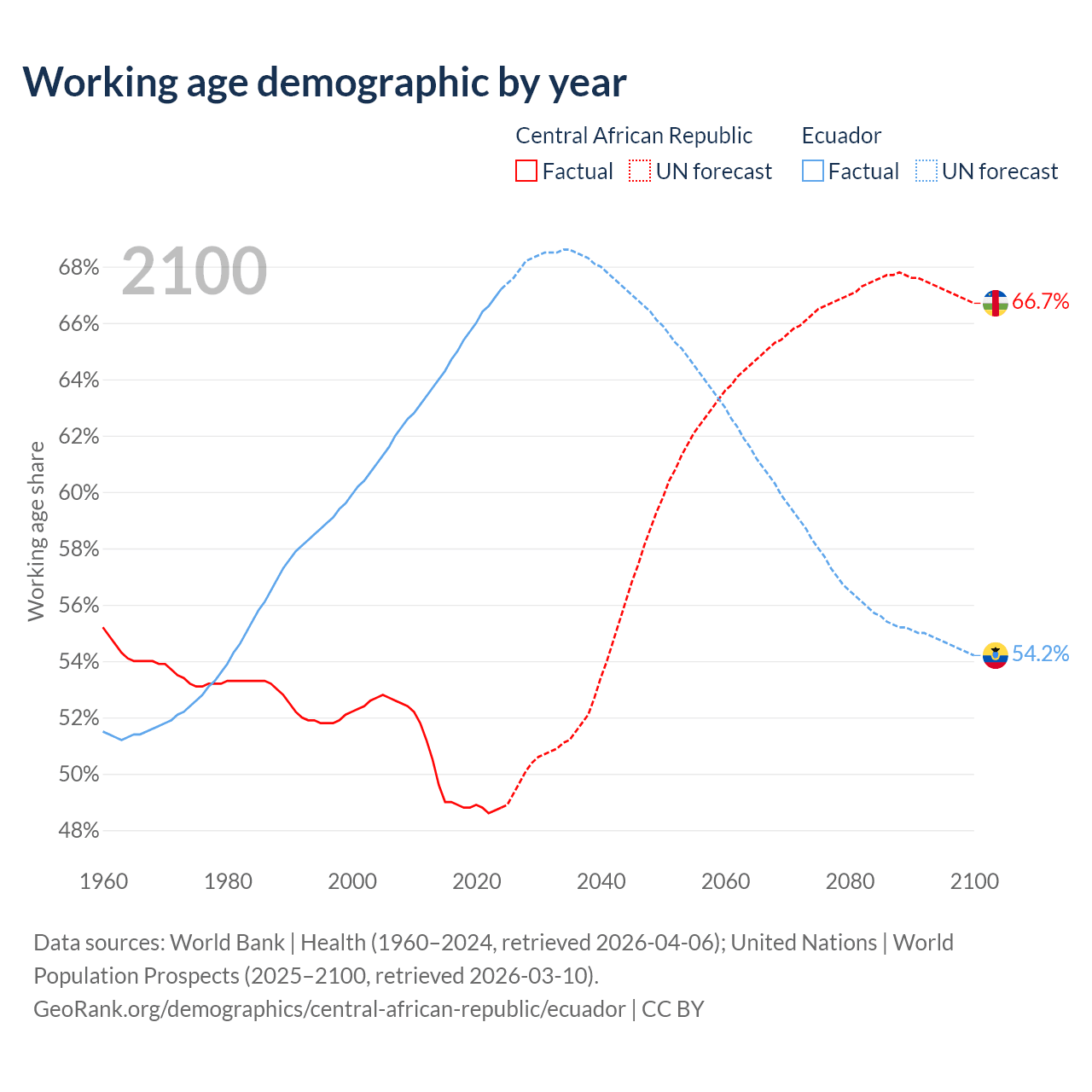 - The Central African Republic has 2.81M working age adults (aged 15-64) vs 12.4M in Ecuador.