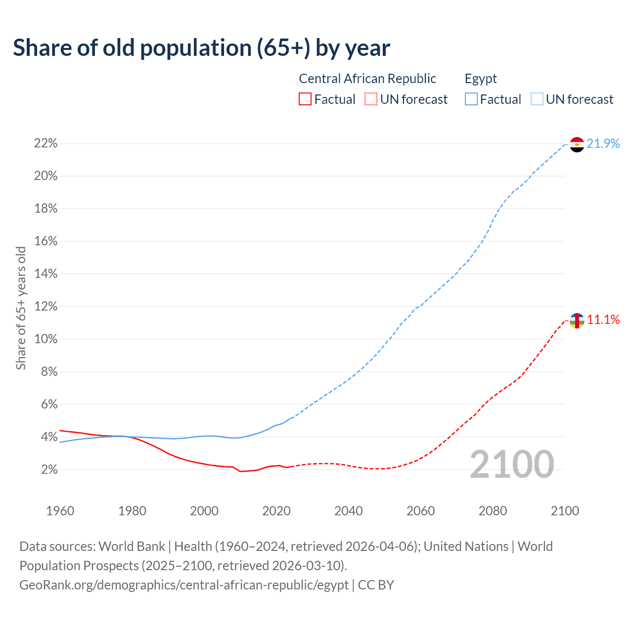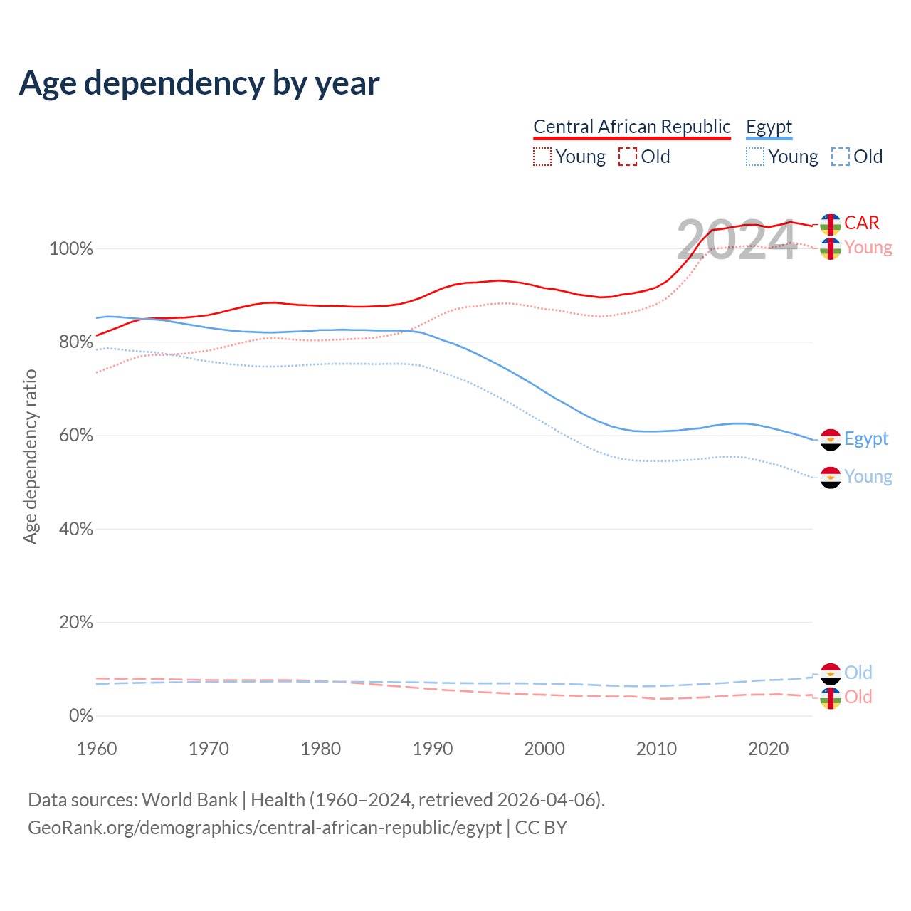 - The share of old-age demographic (65+) in the Central African Republic is 2.15% vs 5.12% in Egypt.