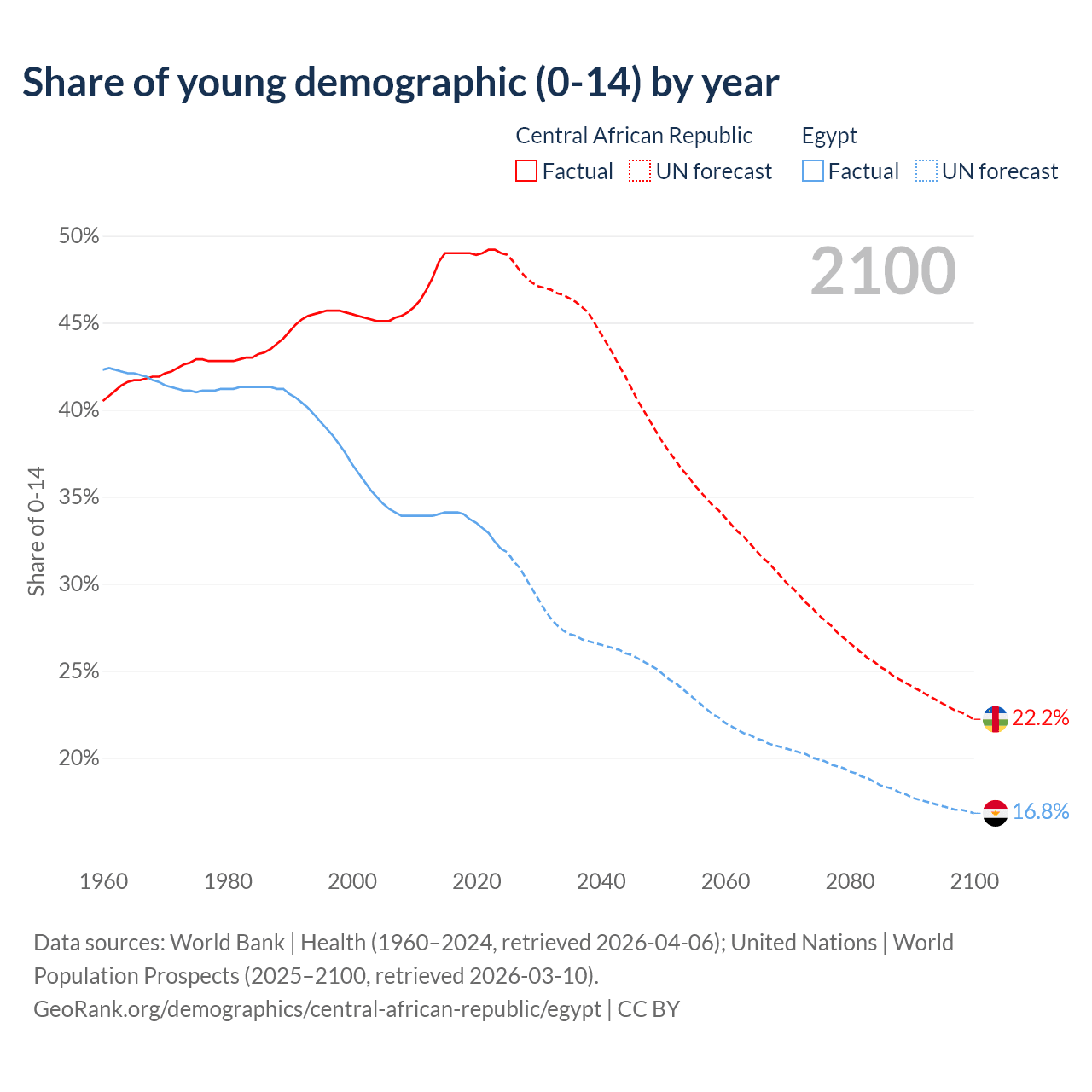 - The share of young demographic (0-15 years old) in the Central African Republic is 49% vs 32% in Egypt.