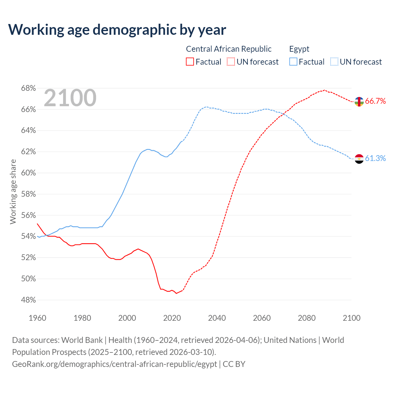 - The Central African Republic has 2.81M working age adults (aged 15-64) vs 75.9M in Egypt.