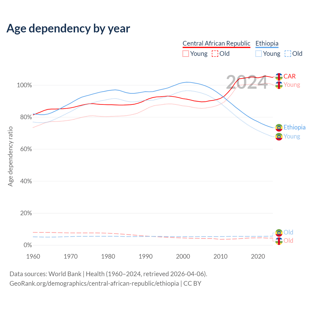 - The share of old-age demographic (65+) in the Central African Republic is 2.15% vs 3.23% in Ethiopia.