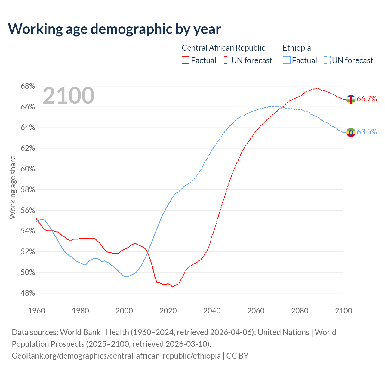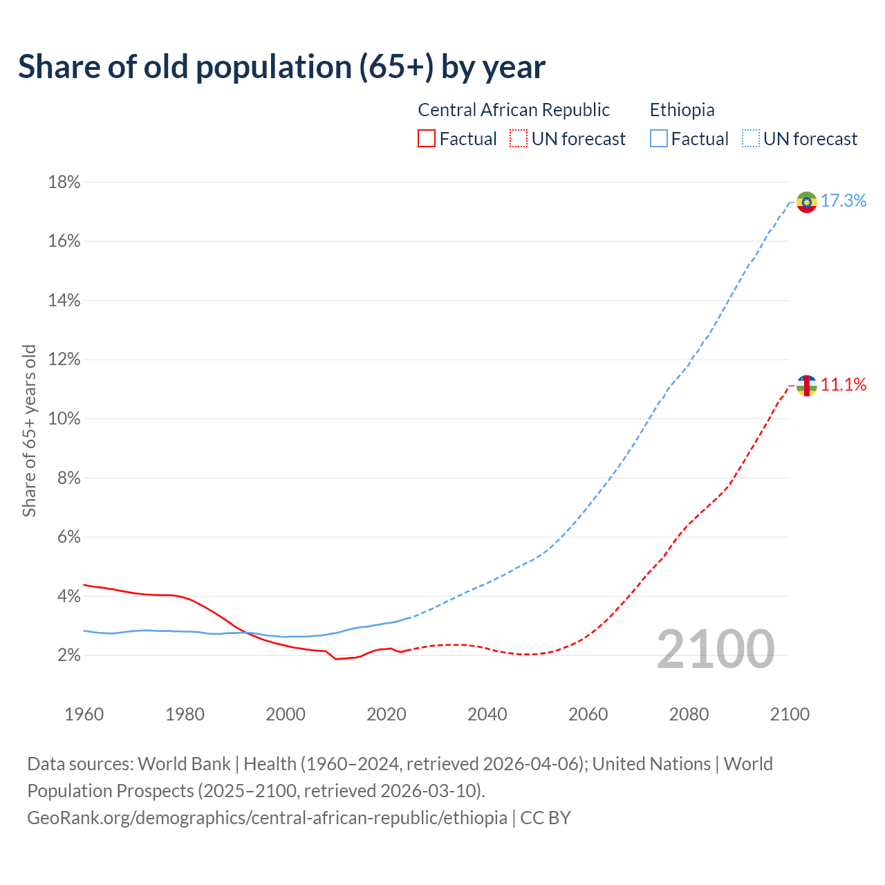 The share of older people aged 65 and over is 2.15% in the Central African Republic and 3.23% in Ethiopia. Life expectancy in the Central African Republic compared to Ethiopia .