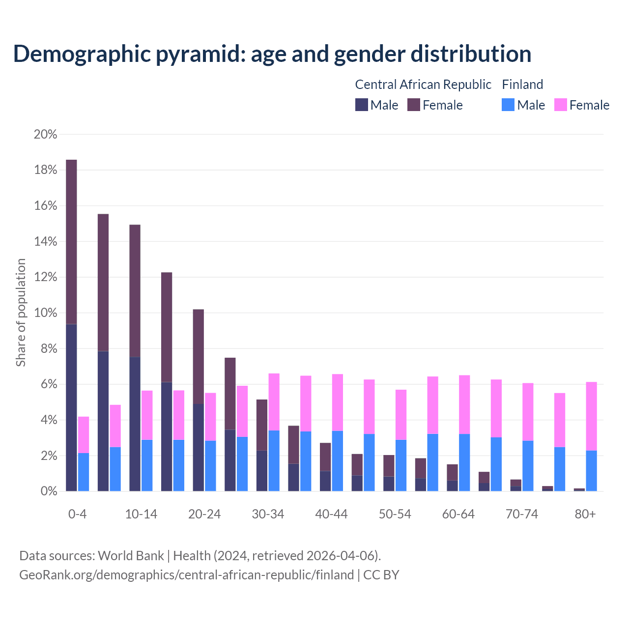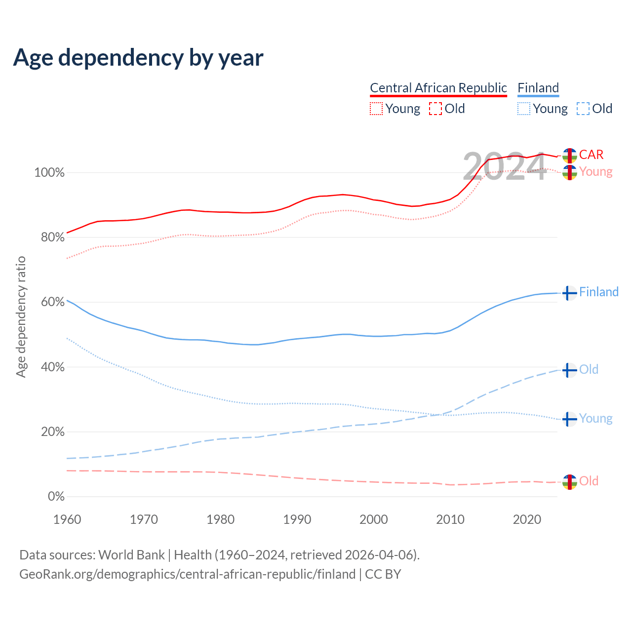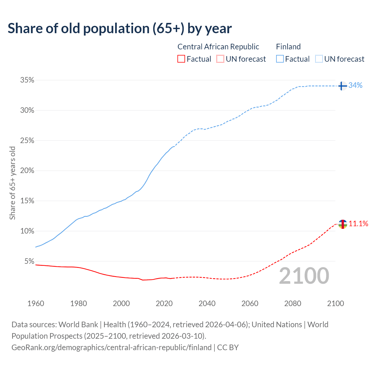 - The share of old-age demographic (65+) in the Central African Republic is 2.15% vs 23.9% in Finland.