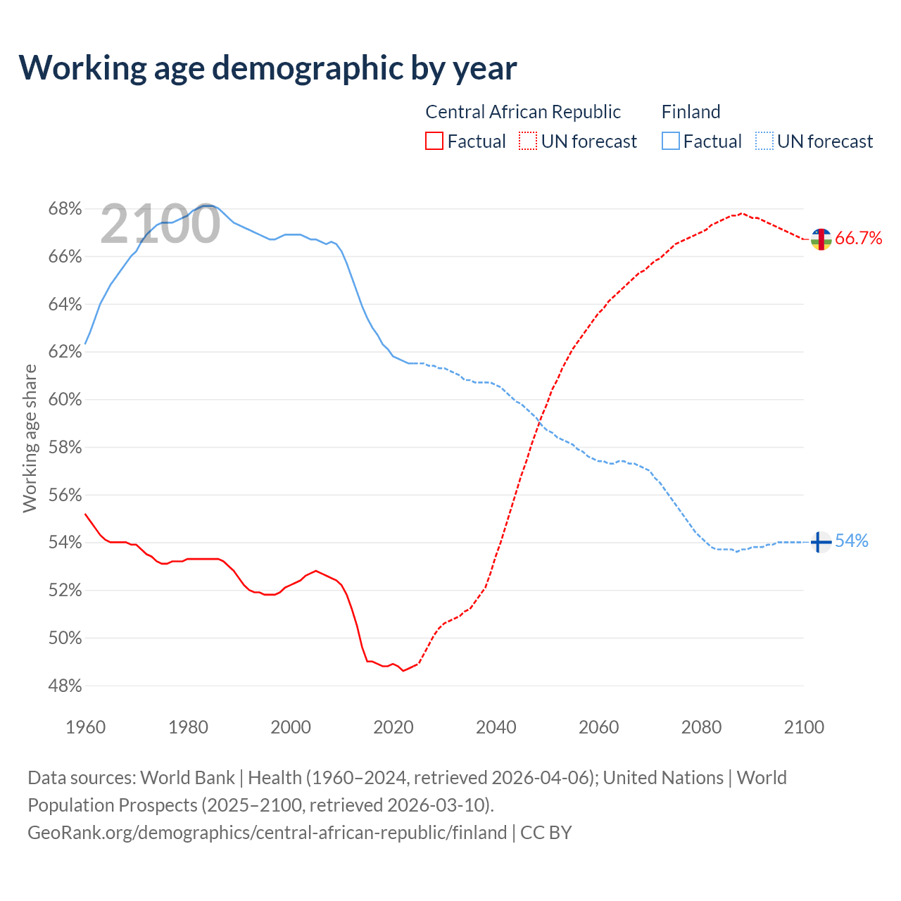 - The Central African Republic has 2.81M working age adults (aged 15-64) vs 3.46M in Finland.