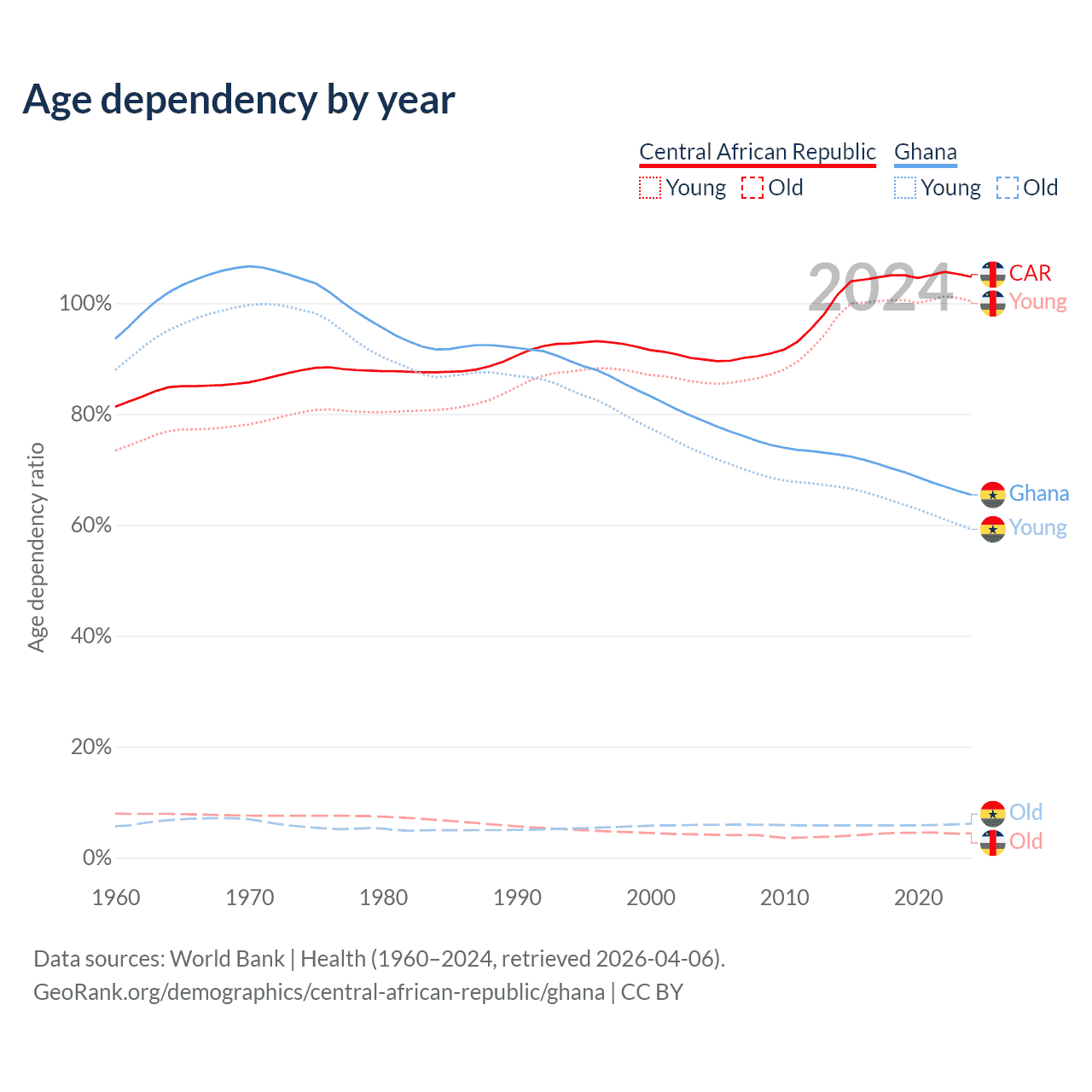- The Central African Republic is ranked 196/196 by median age (oldest to youngest) vs 146/196 for Ghana.