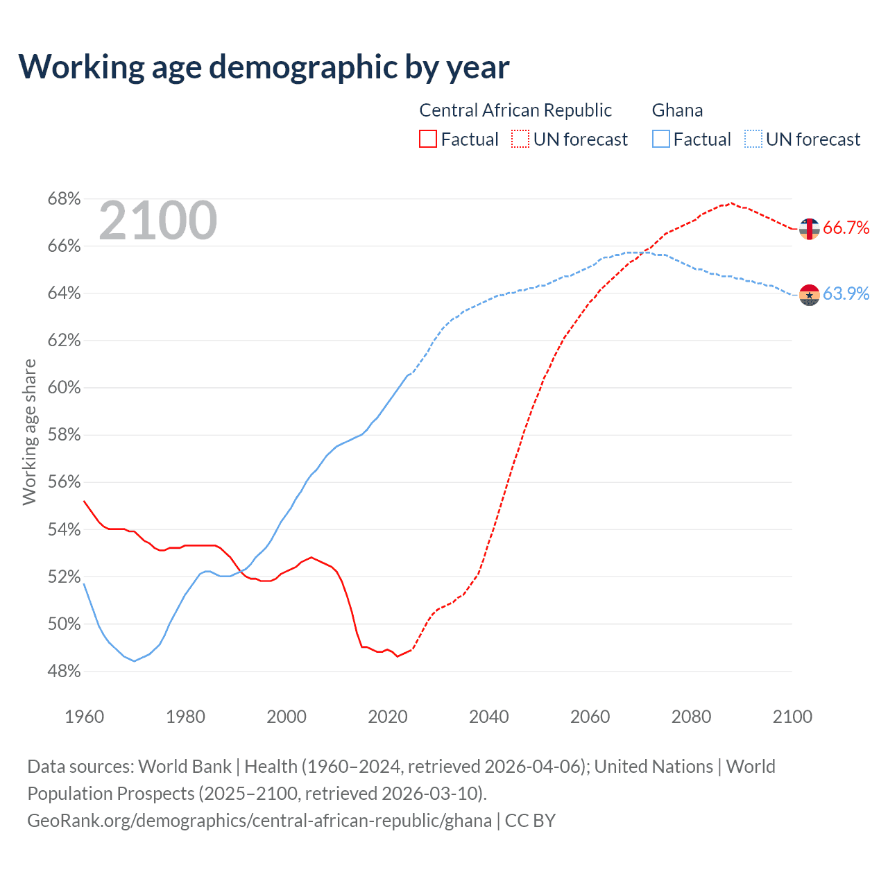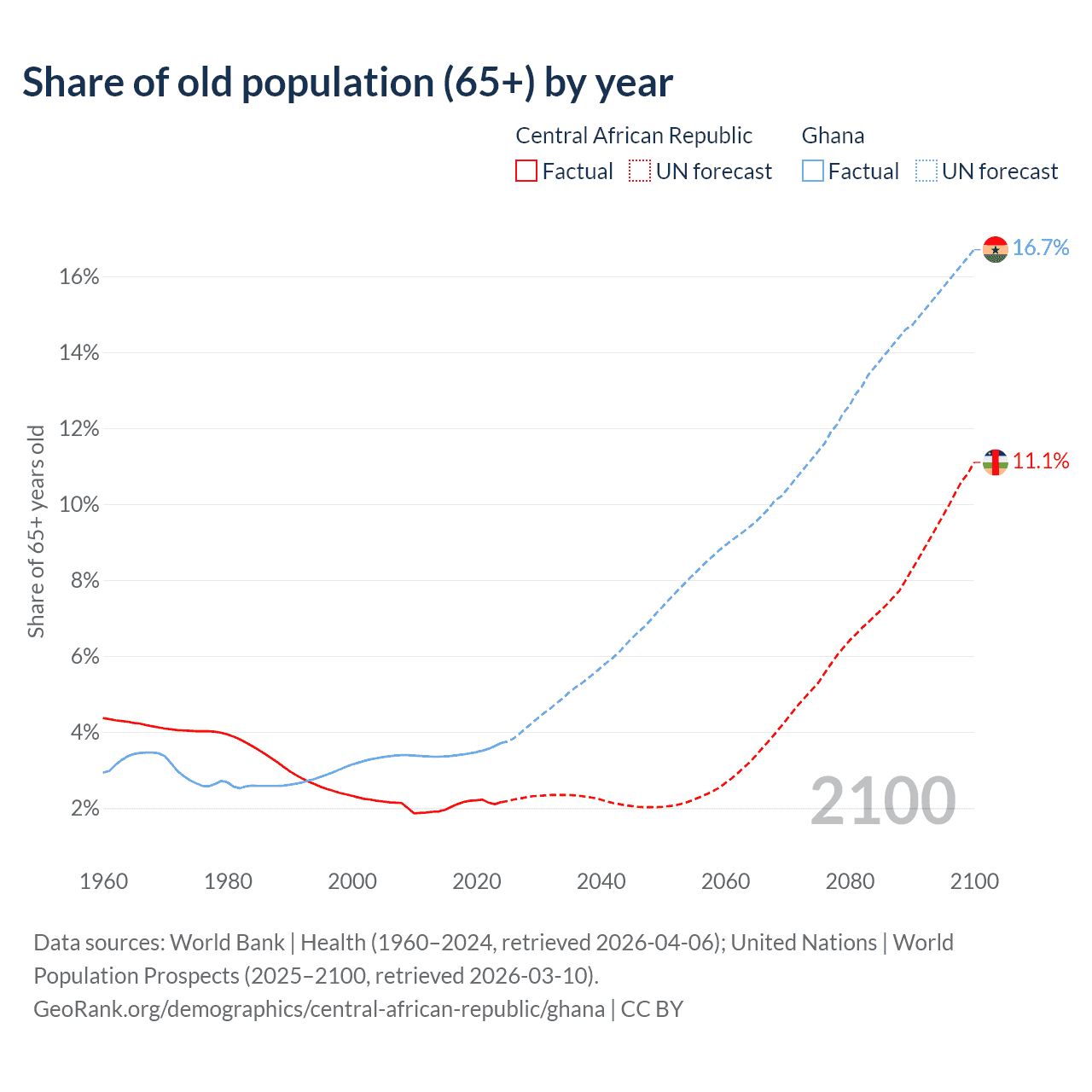 The share of older people aged 65 and over is 2.15% in the Central African Republic and 3.71% in Ghana. Life expectancy in the Central African Republic compared to Ghana .