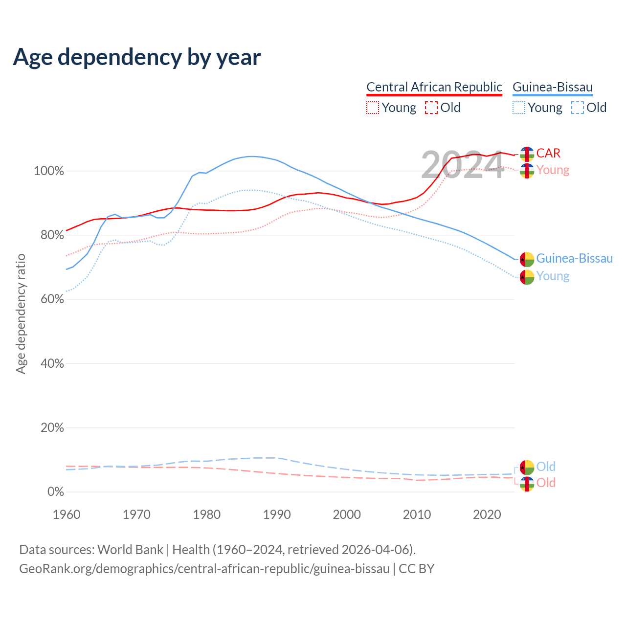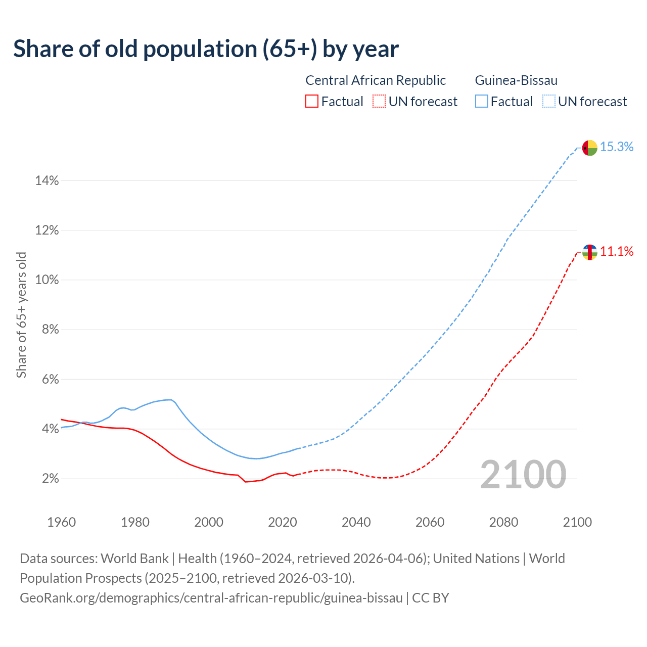 - The share of old-age demographic (65+) in the Central African Republic is 2.15% vs 3.19% in Guinea-Bissau.