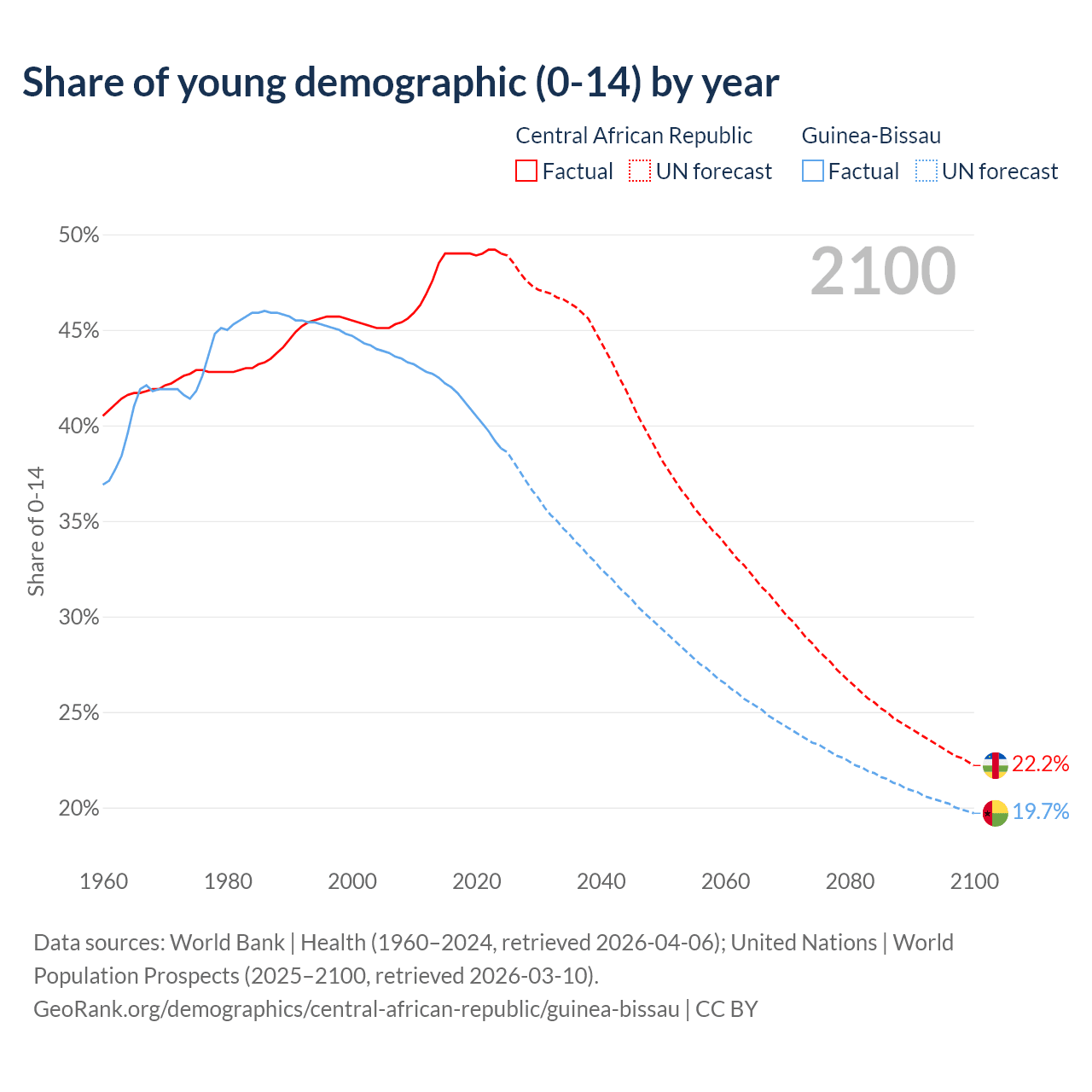 - The share of young demographic (0-15 years old) in the Central African Republic is 49% vs 38.8% in Guinea-Bissau.