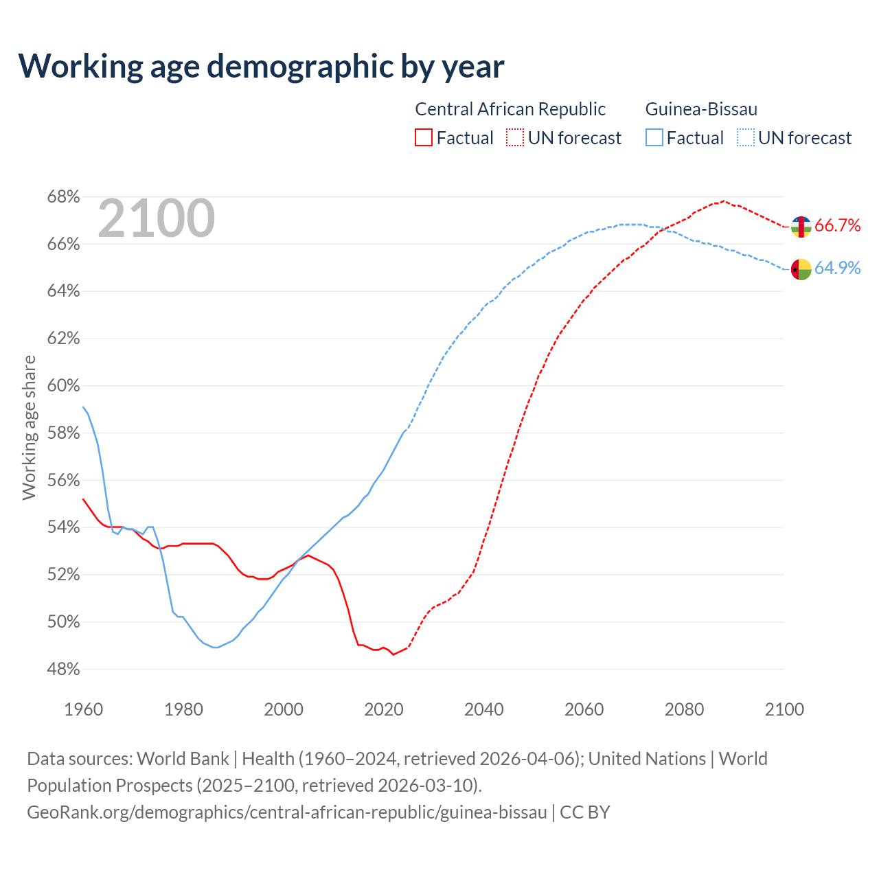 - The Central African Republic has 2.81M working age adults (aged 15-64) vs 1.34M in Guinea-Bissau.