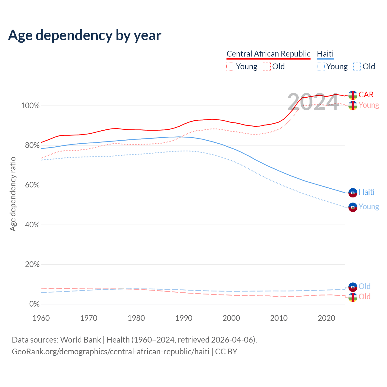 - The share of old-age demographic (65+) in the Central African Republic is 2.15% vs 4.71% in Haiti.