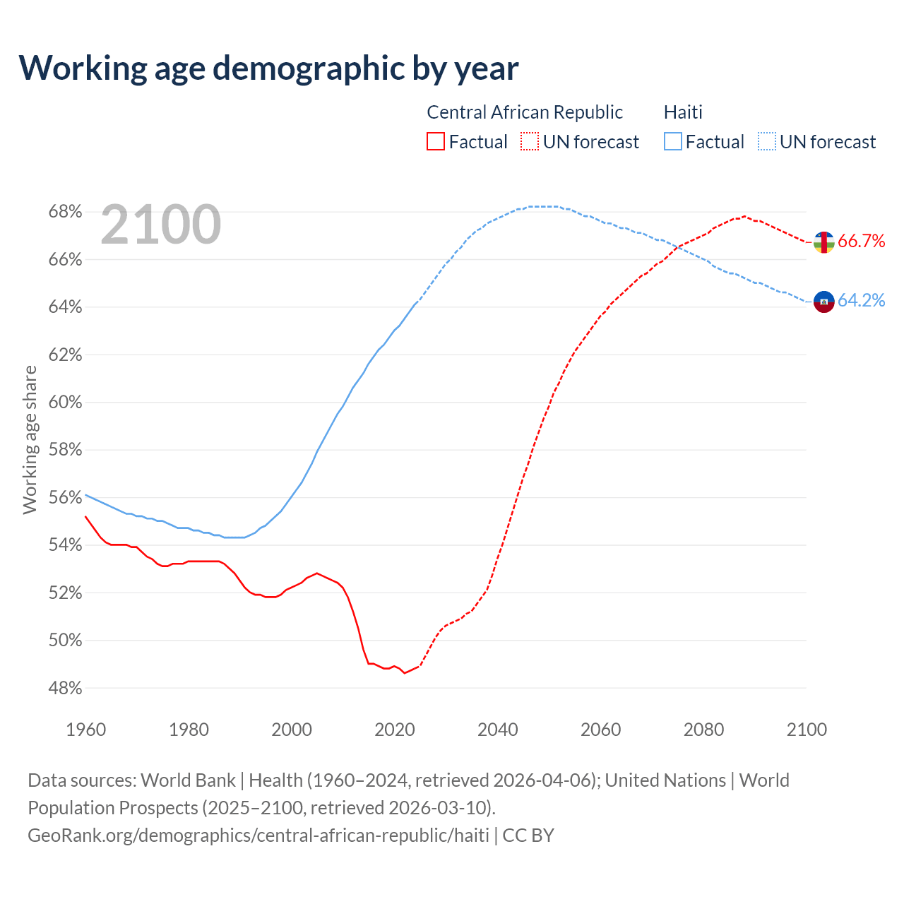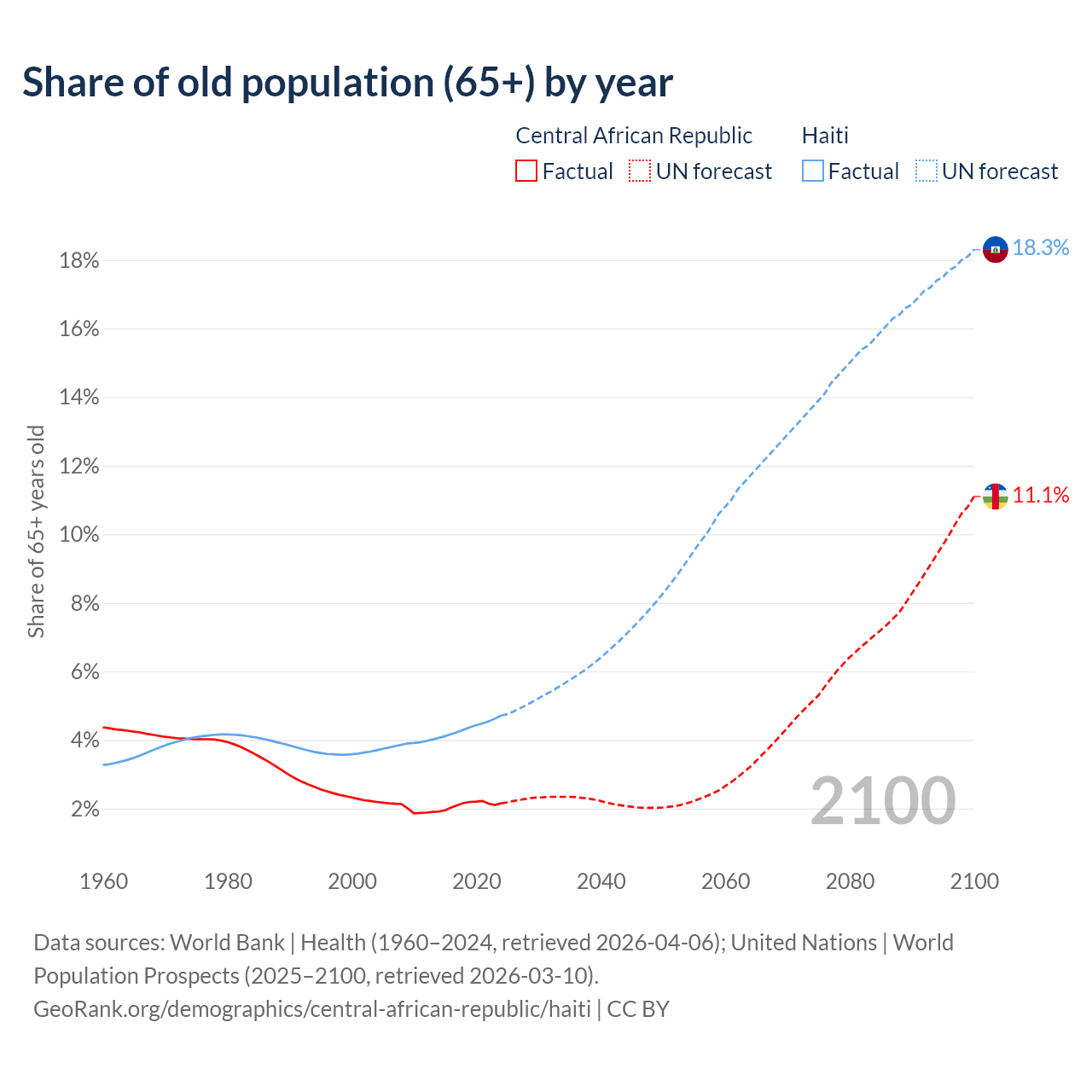 The share of older people aged 65 and over is 2.15% in the Central African Republic and 4.71% in Haiti. Life expectancy in the Central African Republic compared to Haiti .