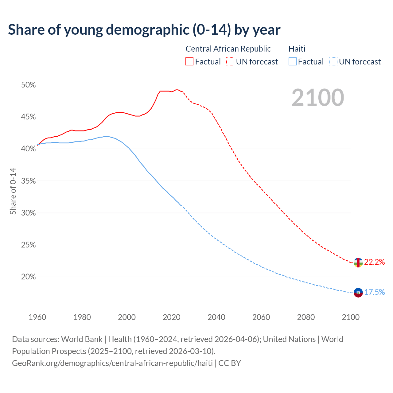 - The share of young demographic (0-15 years old) in the Central African Republic is 49% vs 31.2% in Haiti.