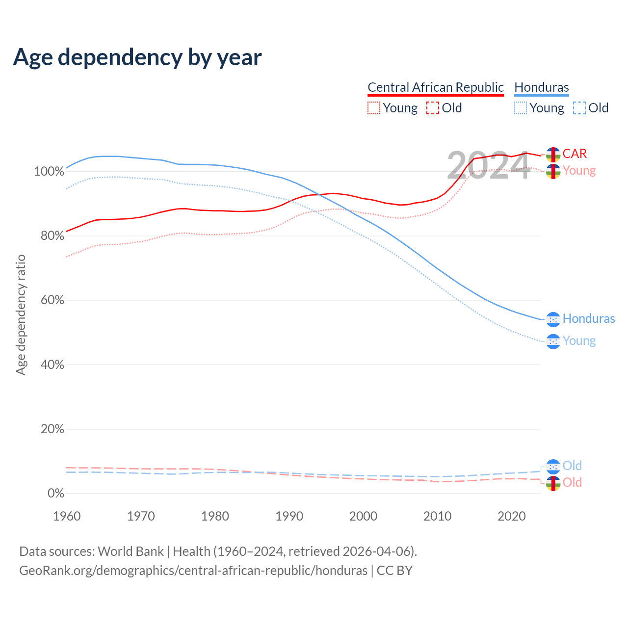 - The Central African Republic is ranked 196/196 by median age (oldest to youngest) vs 134/196 for Honduras.