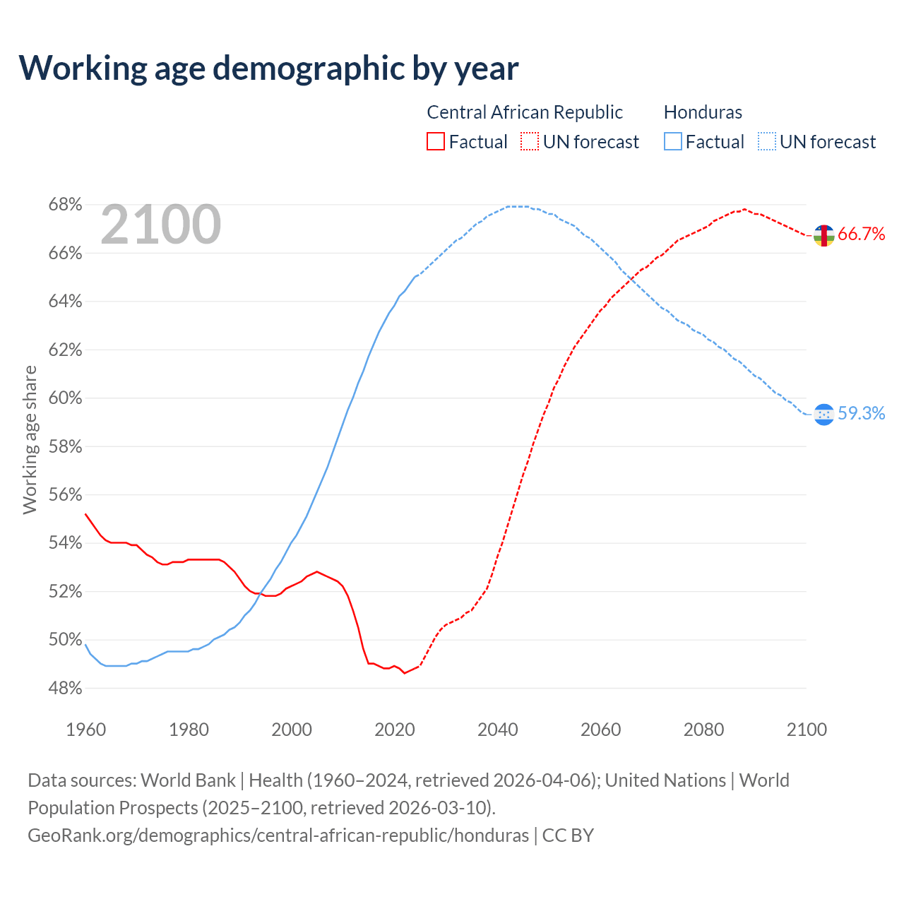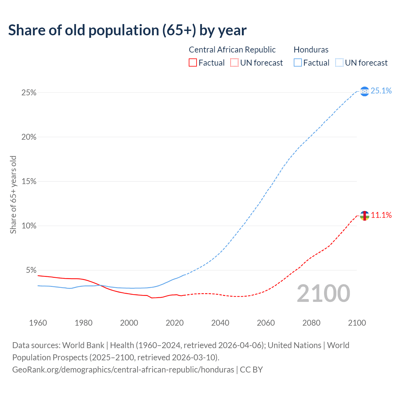 - The share of old-age demographic (65+) in the Central African Republic is 2.15% vs 4.42% in Honduras.