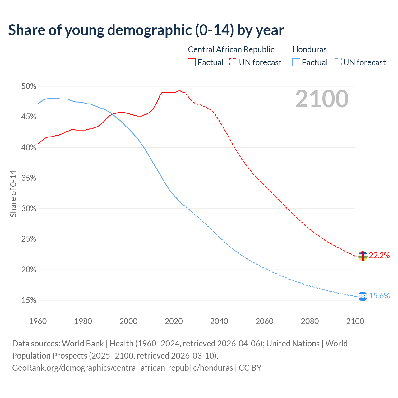 - The share of young demographic (0-15 years old) in the Central African Republic is 49% vs 30.6% in Honduras.