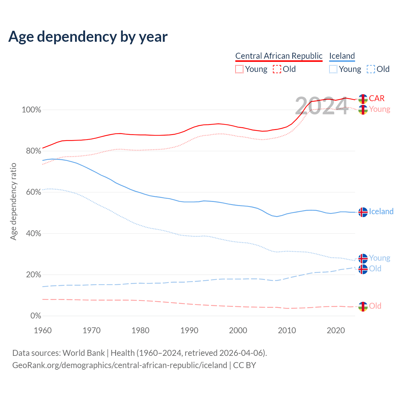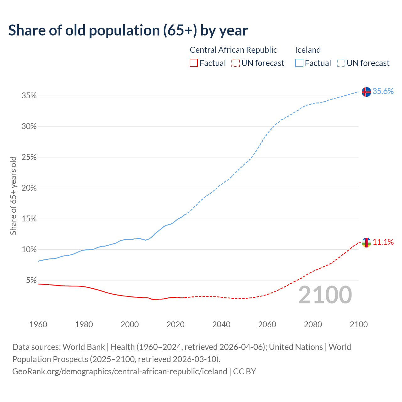 - The share of old-age demographic (65+) in the Central African Republic is 2.15% vs 15.6% in Iceland.