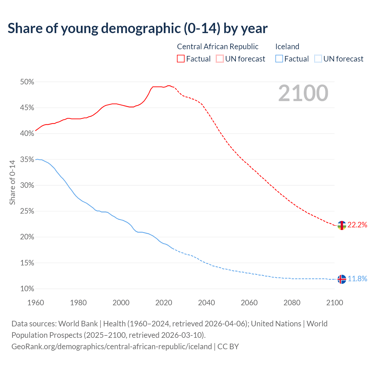 - The share of young demographic (0-15 years old) in the Central African Republic is 49% vs 17.8% in Iceland.