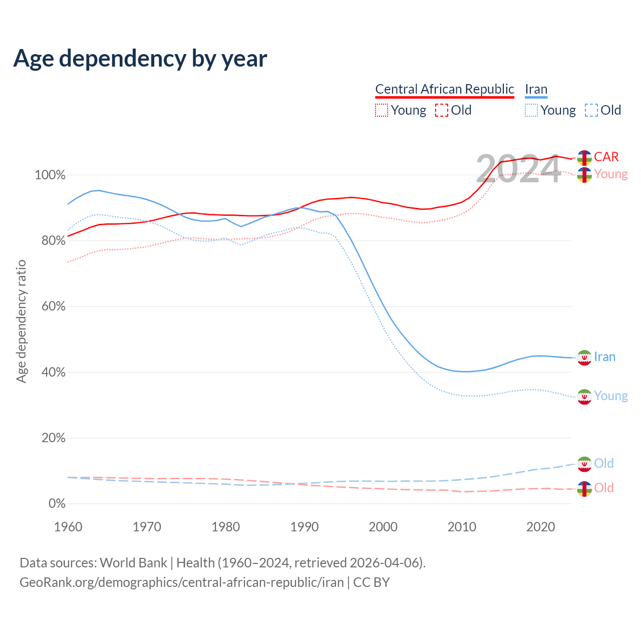 - The share of old-age demographic (65+) in the Central African Republic is 2.15% vs 8.24% in Iran.