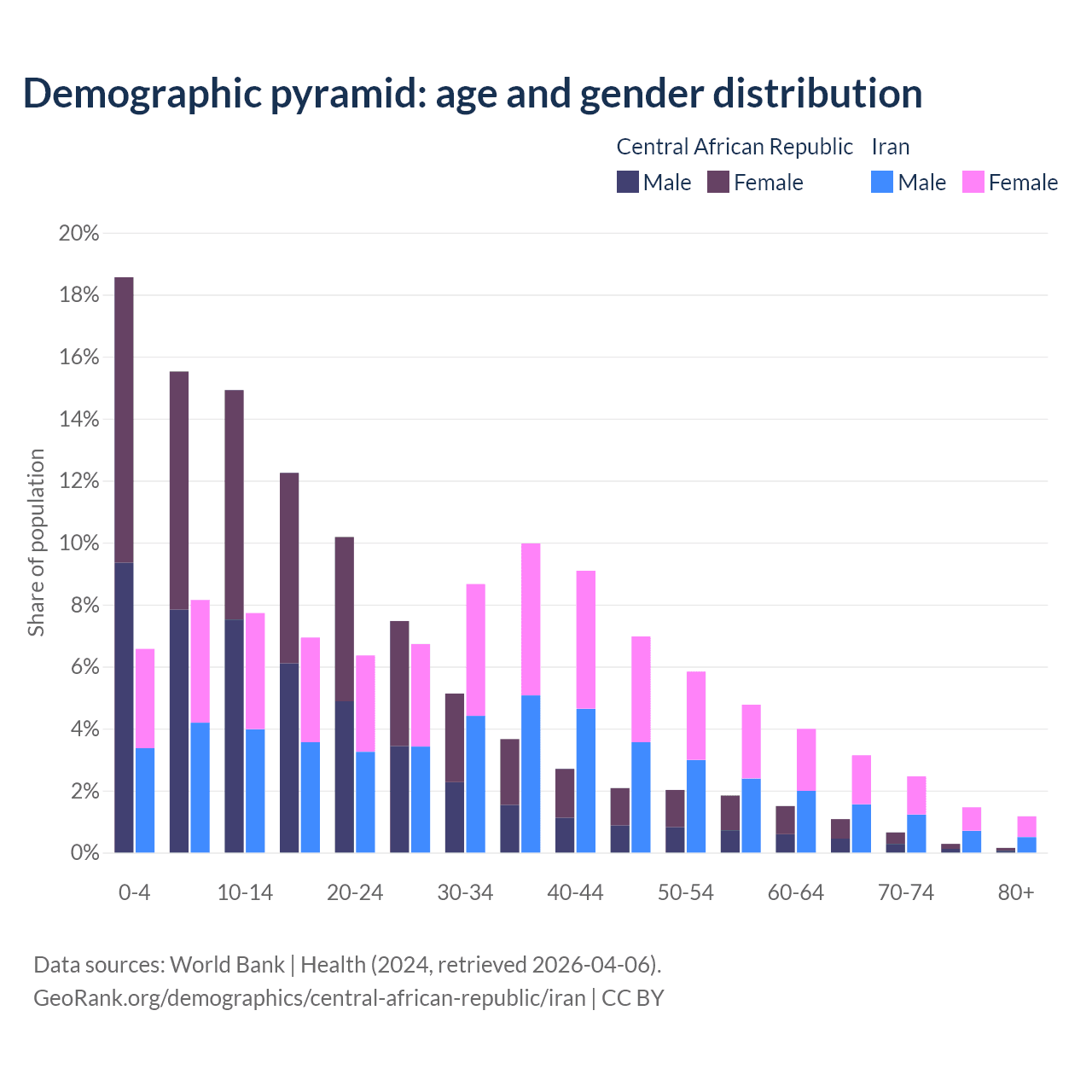 - The Central African Republic is ranked 196/196 by median age (oldest to youngest) vs 79/196 for Iran.