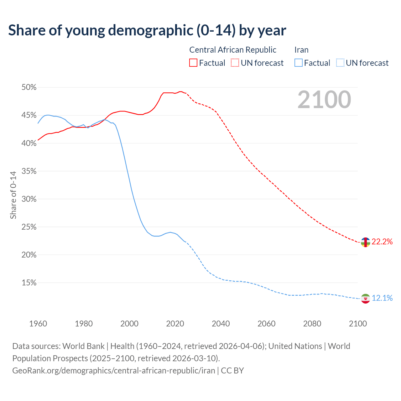 - The share of young demographic (0-15 years old) in the Central African Republic is 49% vs 22.4% in Iran.