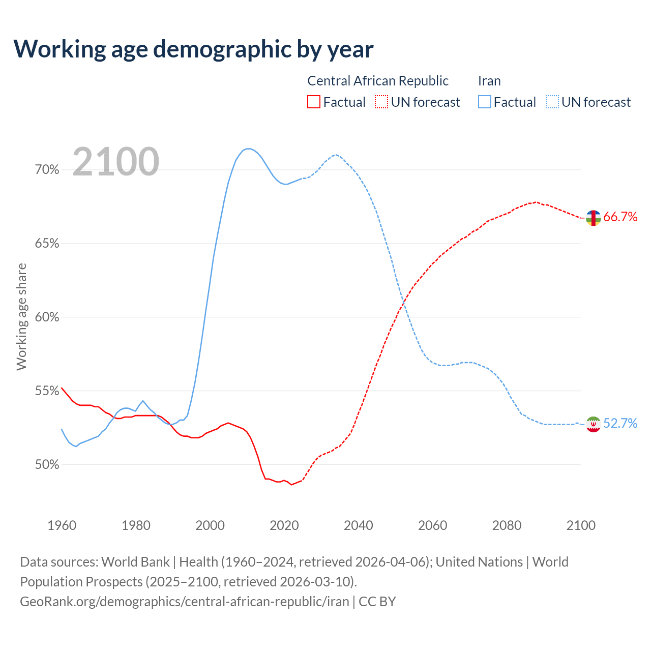- The Central African Republic has 2.81M working age adults (aged 15-64) vs 64.8M in Iran.