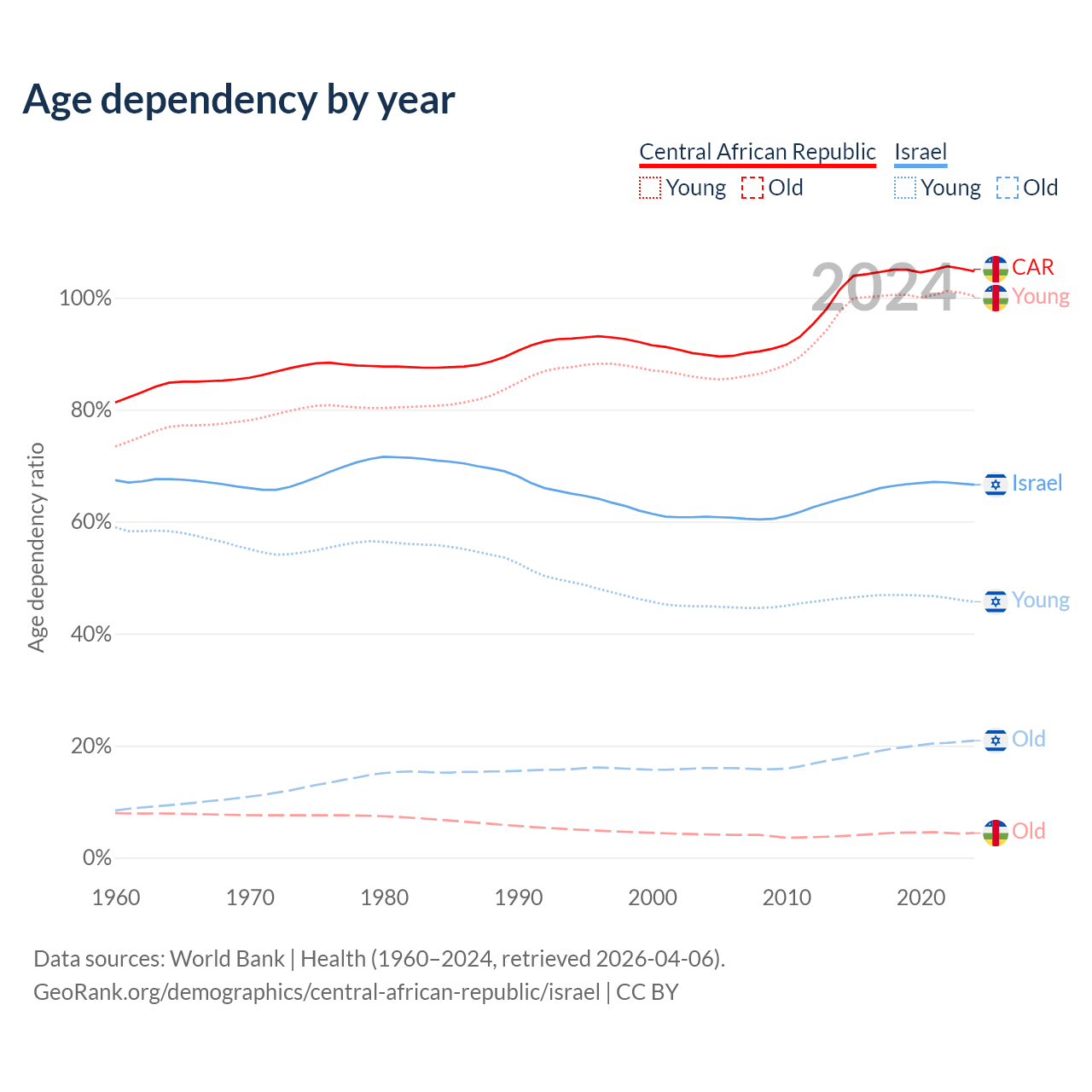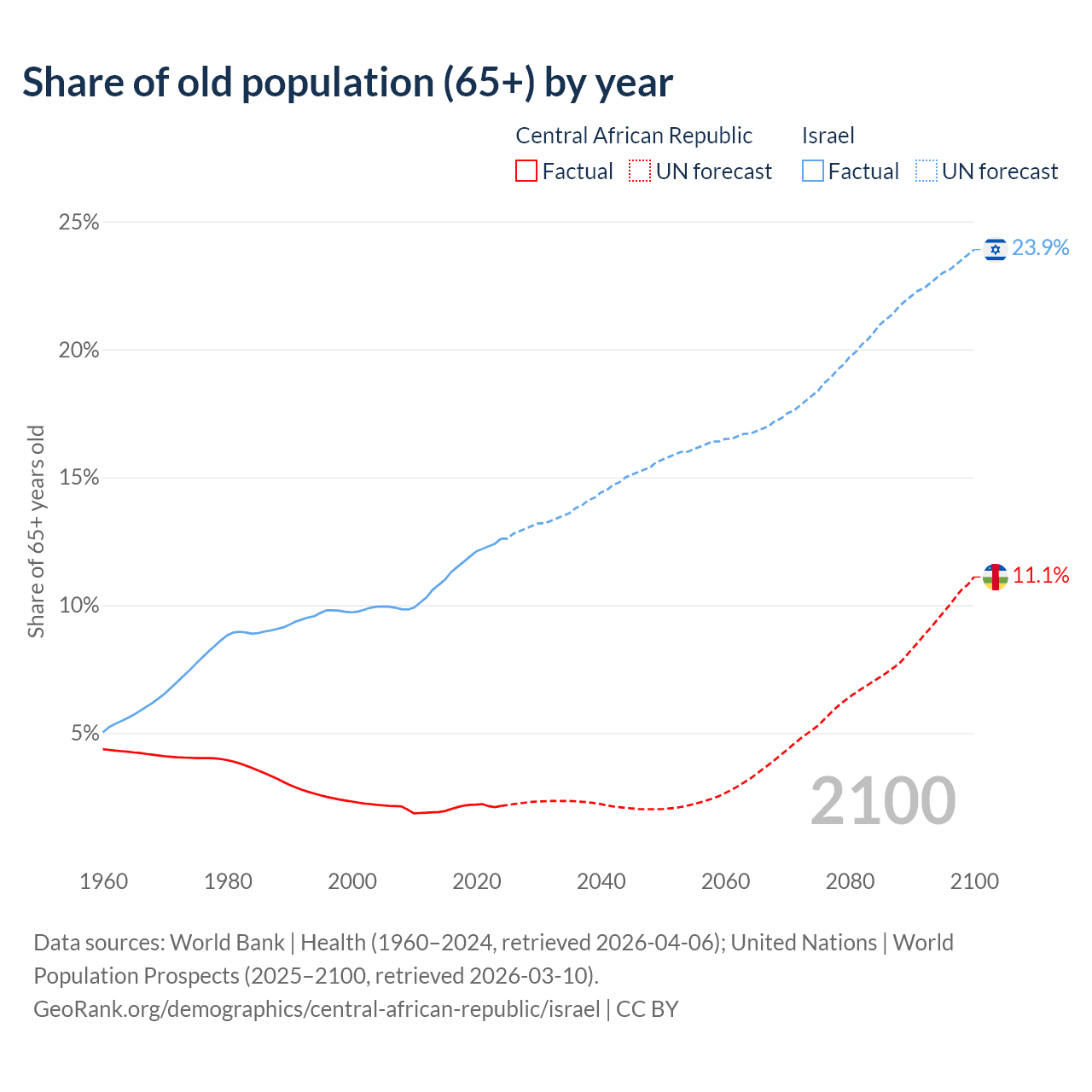 - The share of old-age demographic (65+) in the Central African Republic is 2.15% vs 12.6% in Israel.
