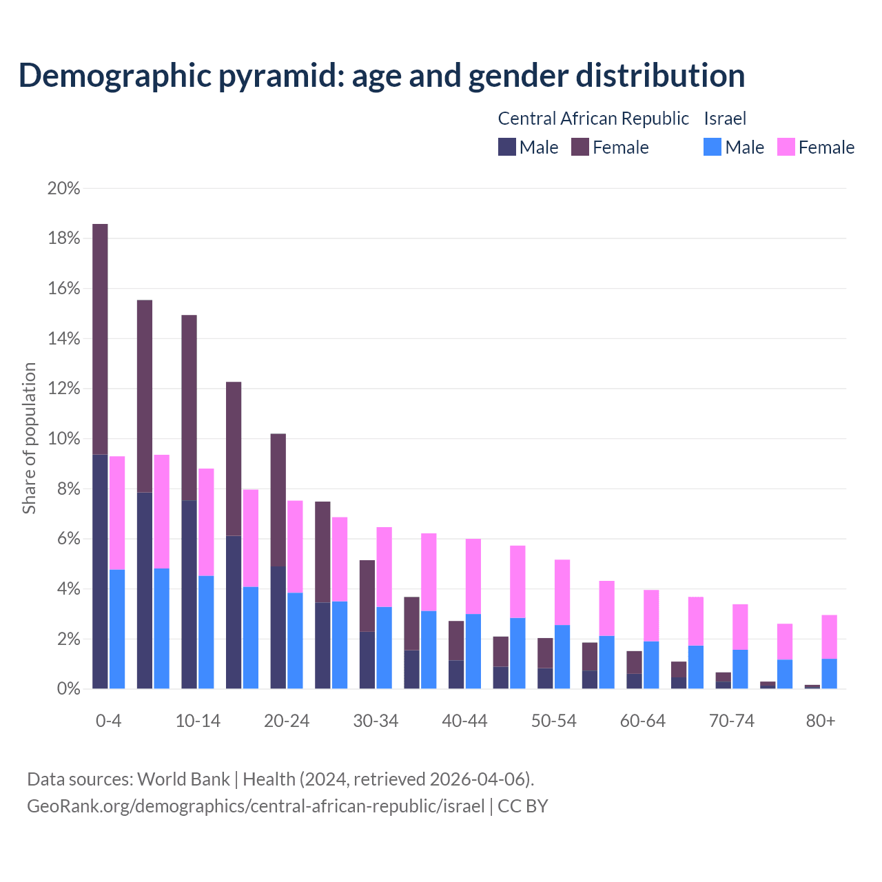- As of 2026, the population of the Central African Republic is 5.75M vs 10.3M in Israel - 1.79 times difference.