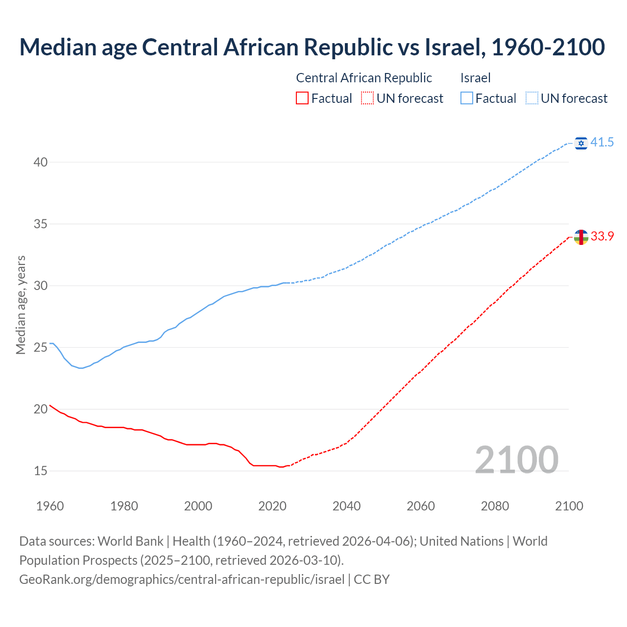 - The median age in the Central African Republic is 15.4 years compared to 30.2 years in Israel.