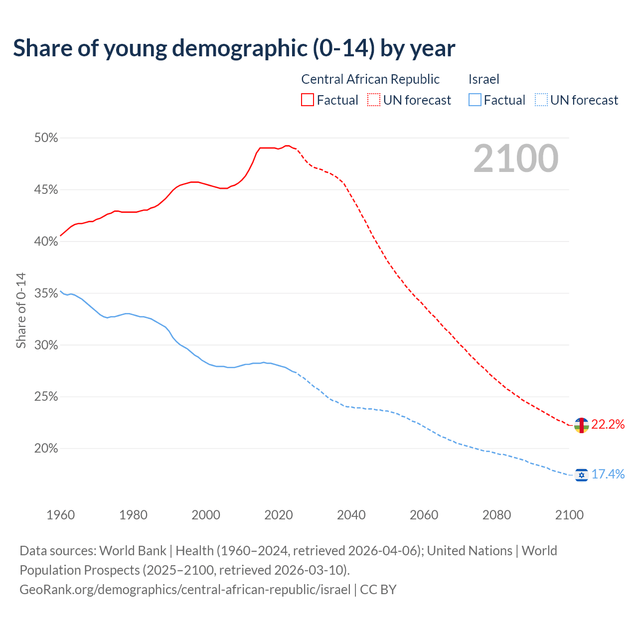 - The share of young demographic (0-15 years old) in the Central African Republic is 49% vs 27.4% in Israel.