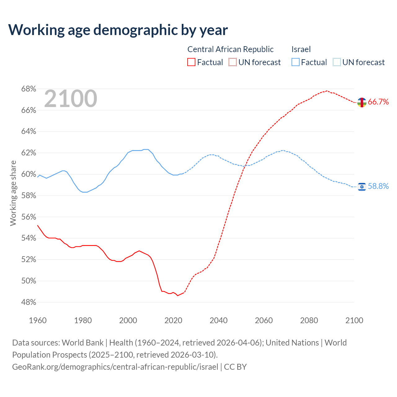 - The Central African Republic has 2.81M working age adults (aged 15-64) vs 6.18M in Israel.