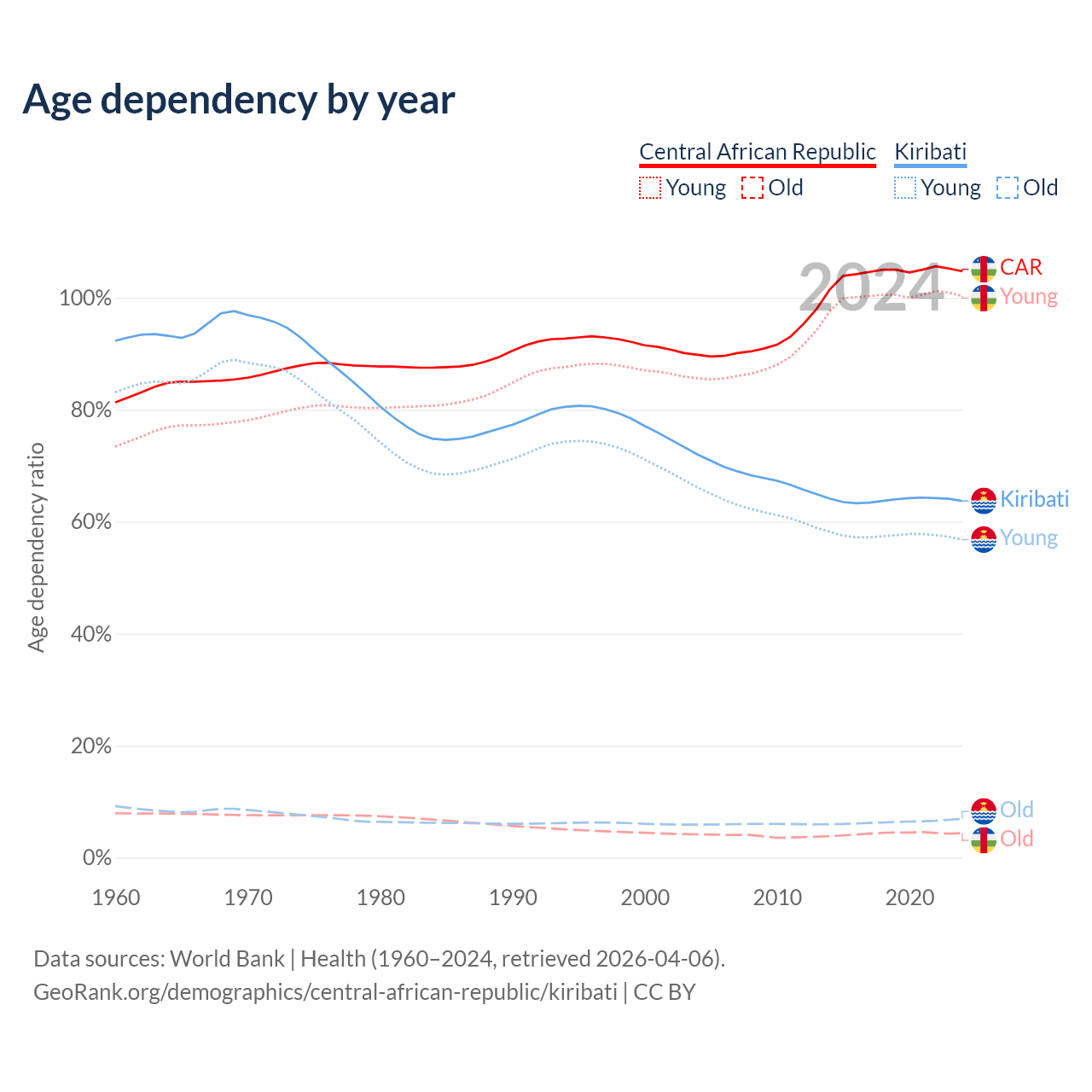- The share of old-age demographic (65+) in the Central African Republic is 2.15% vs 4.24% in Kiribati.