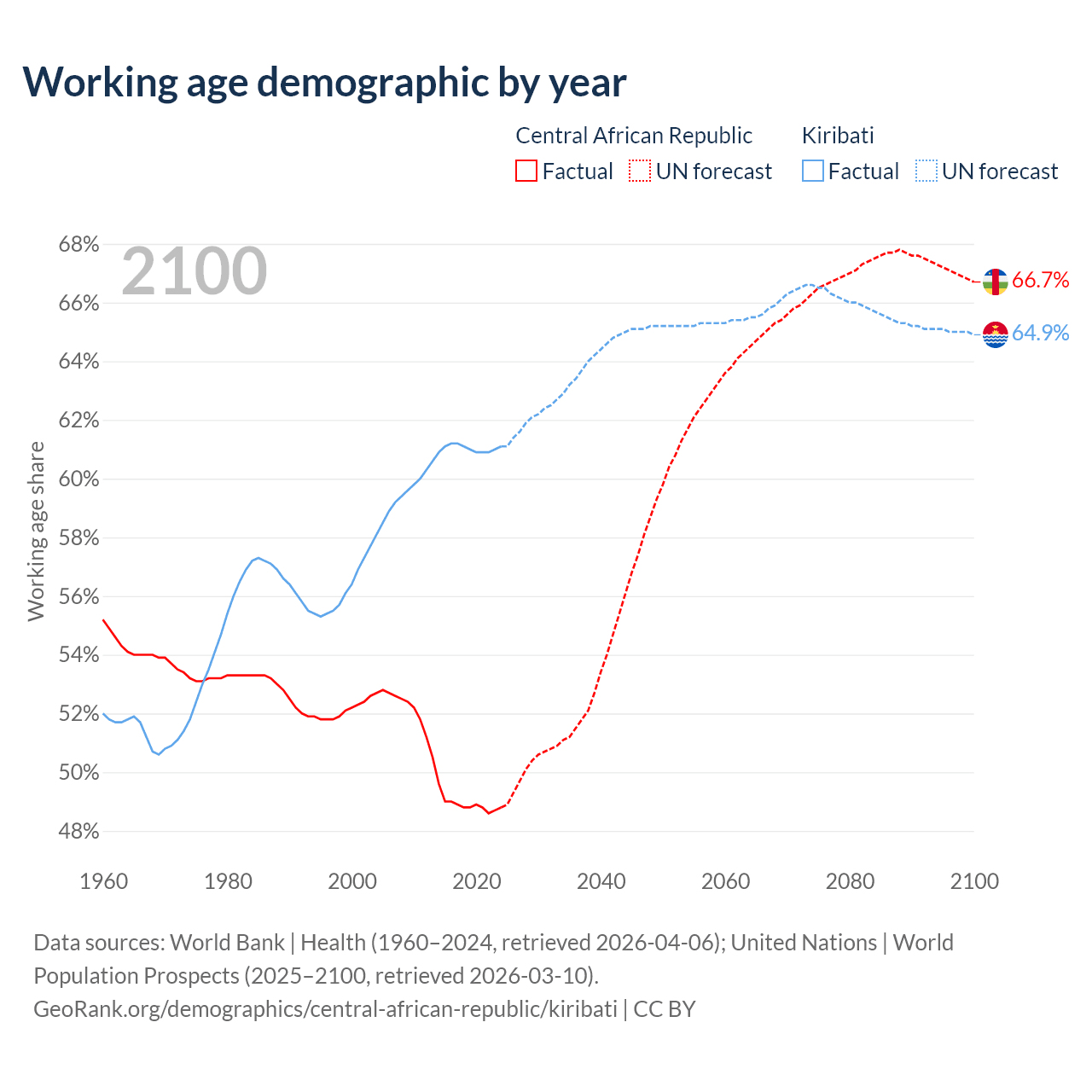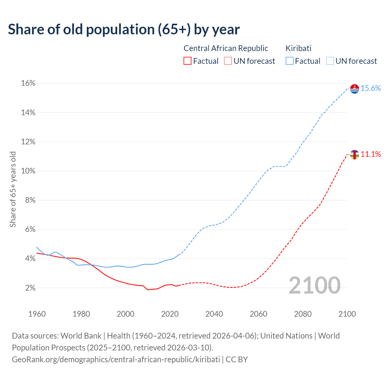 The share of older people aged 65 and over is 2.15% in the Central African Republic and 4.24% in Kiribati. Life expectancy in the Central African Republic compared to Kiribati .