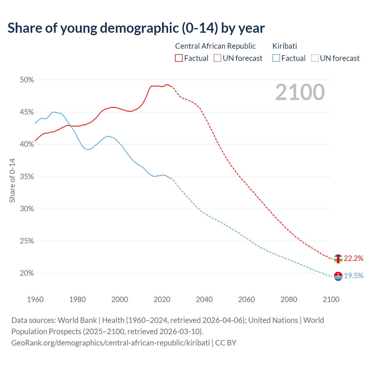 - The share of young demographic (0-15 years old) in the Central African Republic is 49% vs 34.7% in Kiribati.