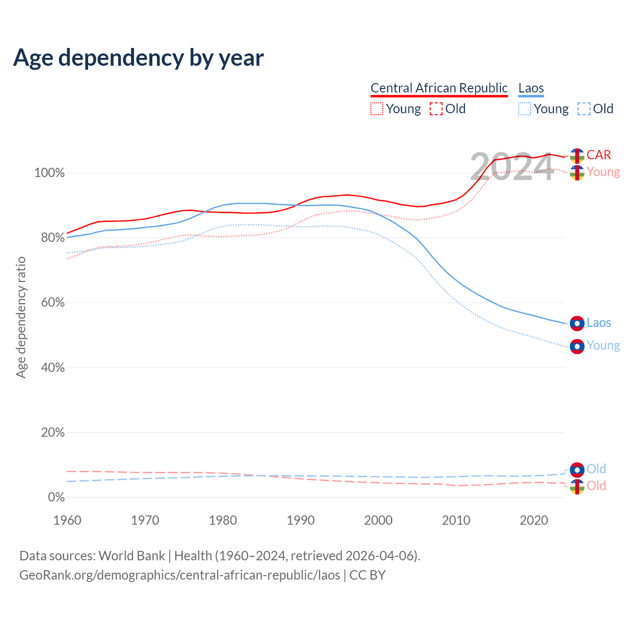 Data sources: World Bank | Health (1960–2024, retrieved 2026-04-06); U.S. Census Bureau (1960–2024, retrieved 2026-02-08).