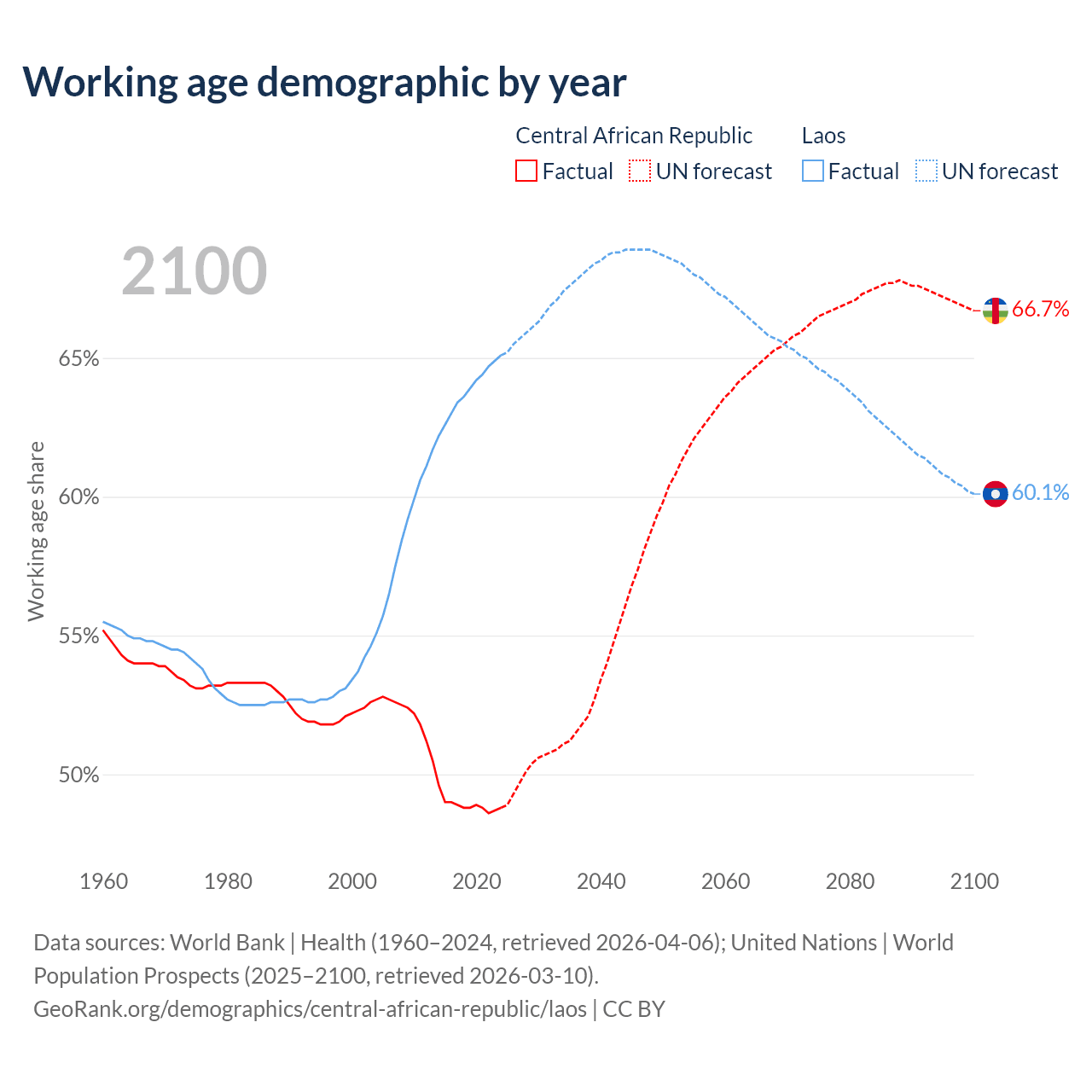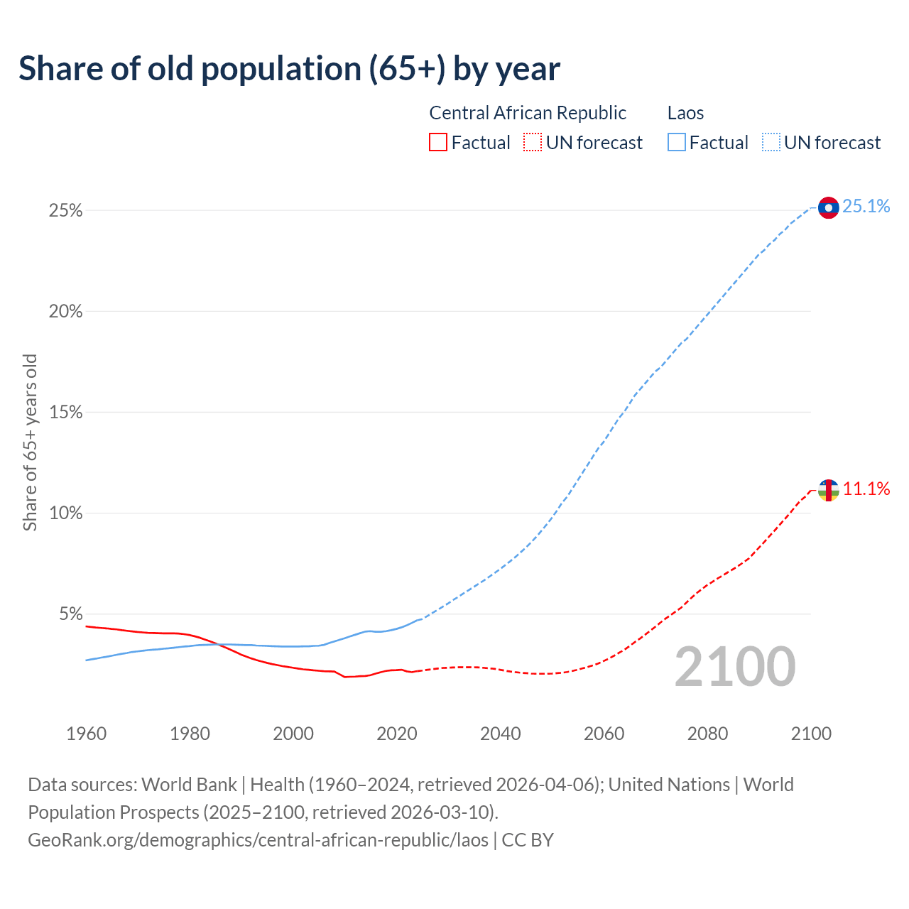 The share of older people aged 65 and over is 2.15% in the Central African Republic and 4.67% in Laos. Life expectancy in the Central African Republic compared to Laos .