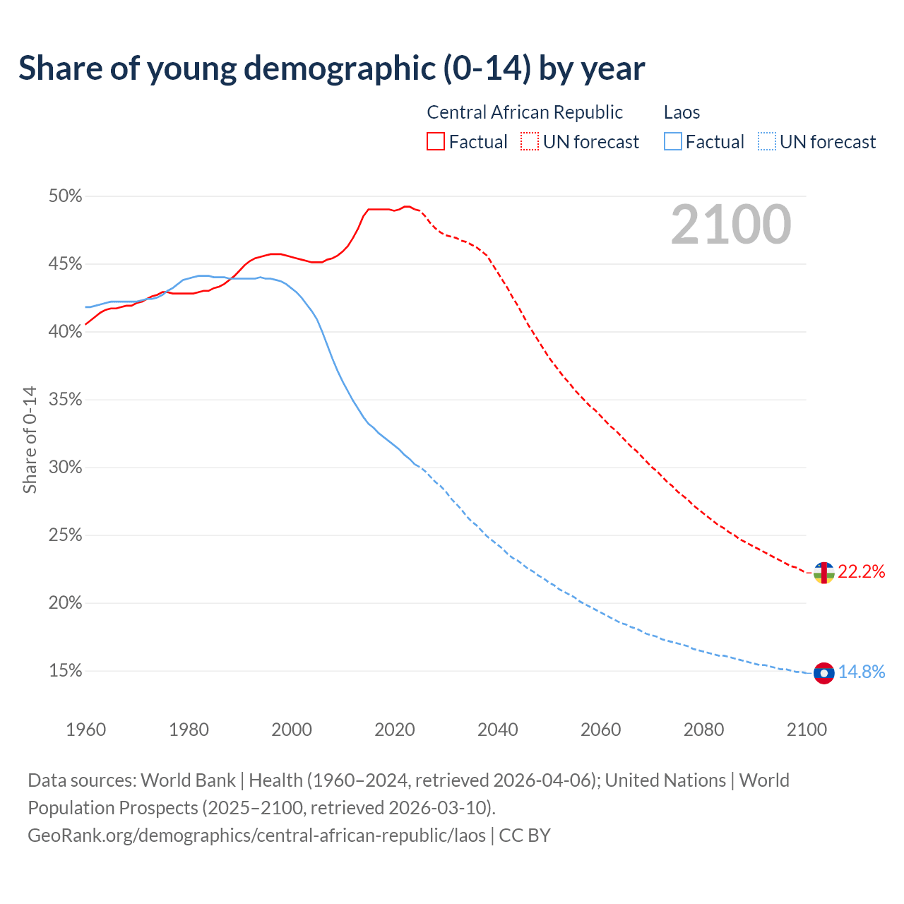 - The share of young demographic (0-15 years old) in the Central African Republic is 49% vs 30.2% in Laos.