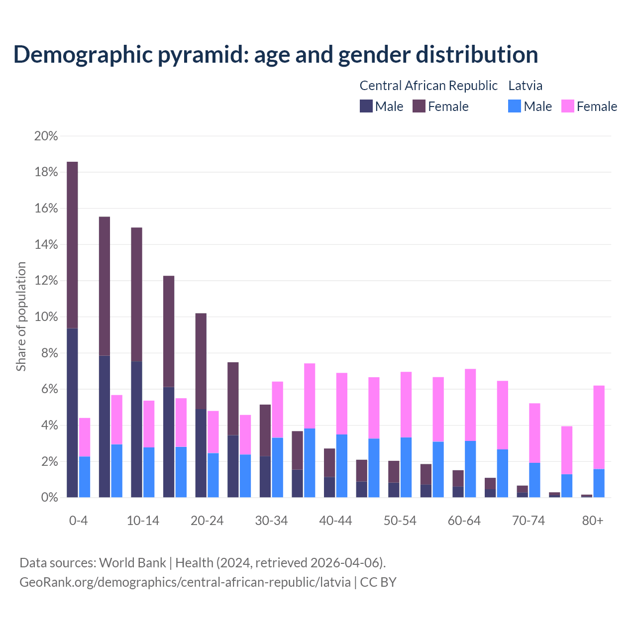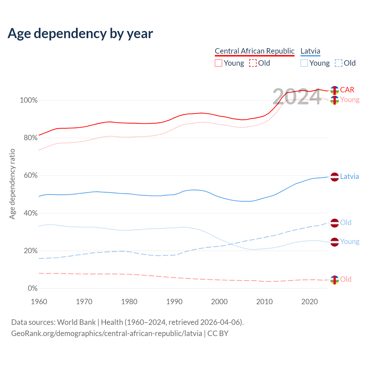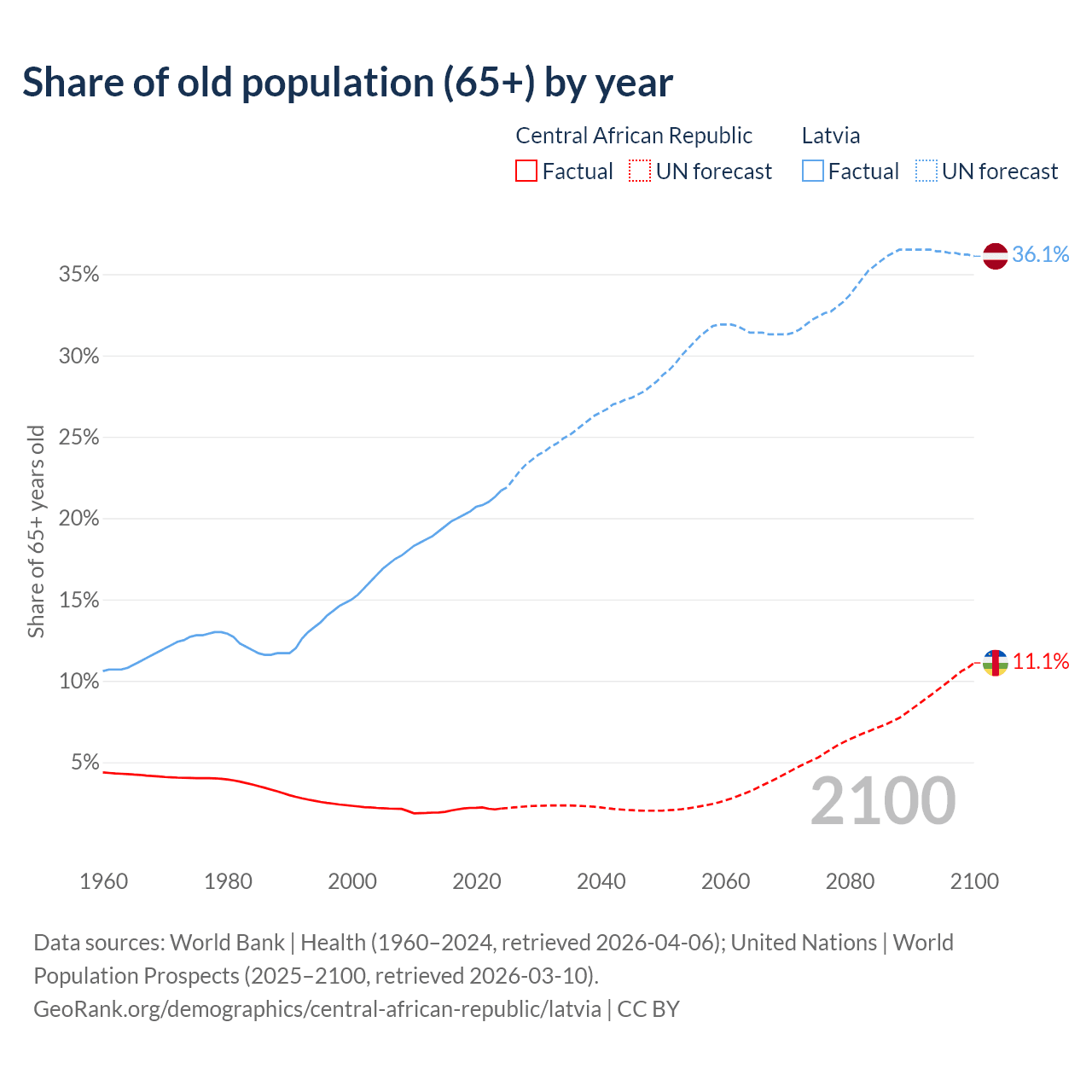 - The share of old-age demographic (65+) in the Central African Republic is 2.15% vs 21.7% in Latvia.