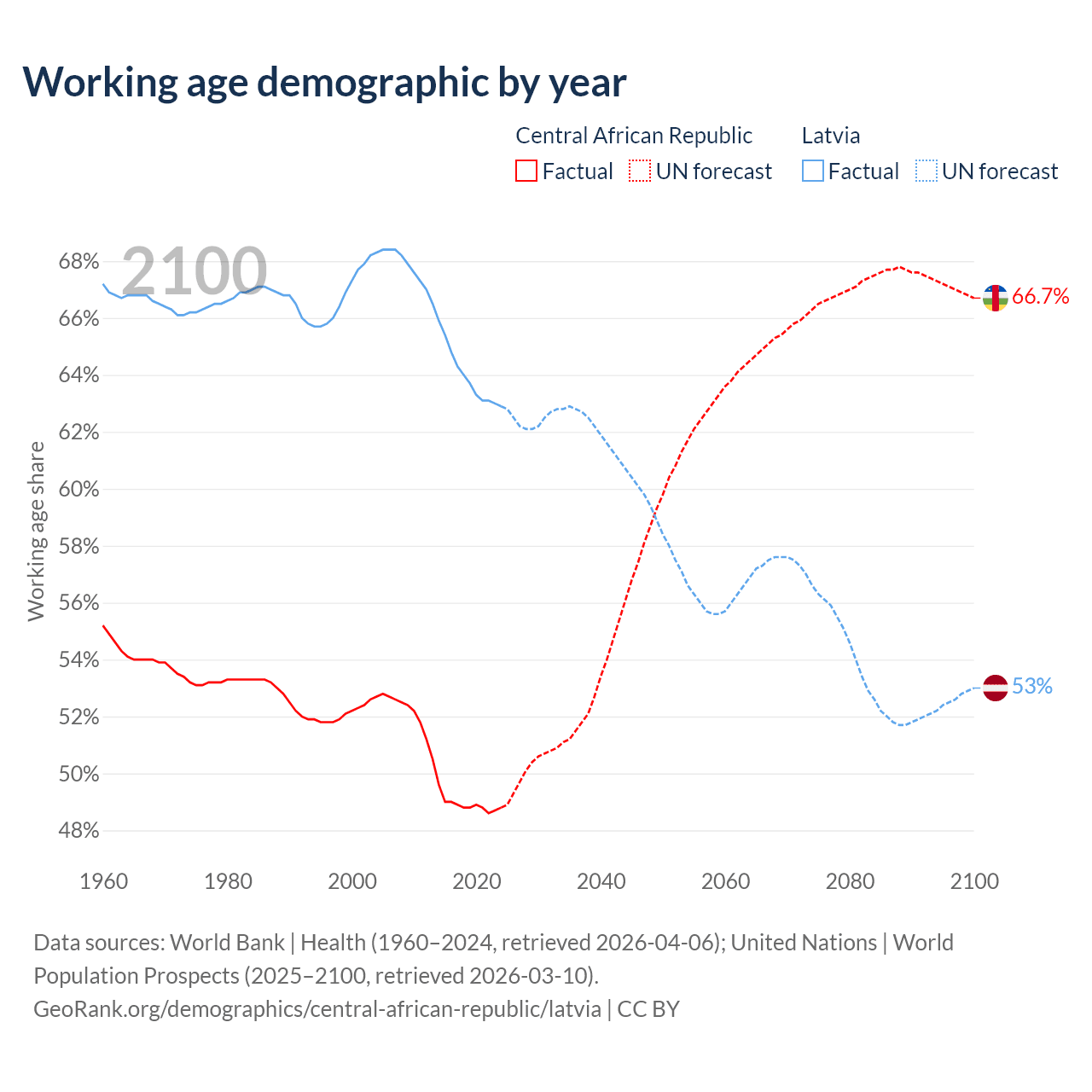 - The Central African Republic has 2.81M working age adults (aged 15-64) vs 1.15M in Latvia.