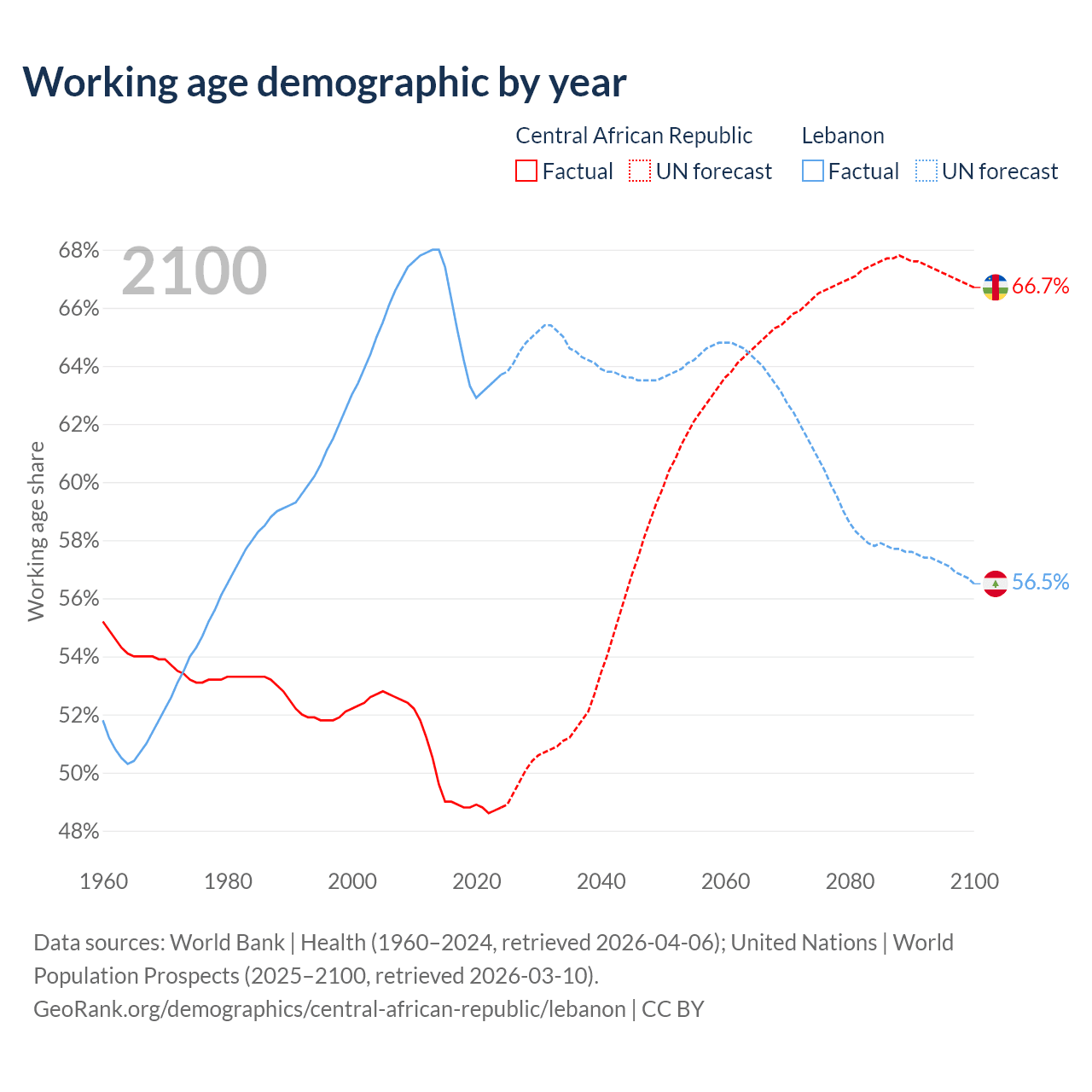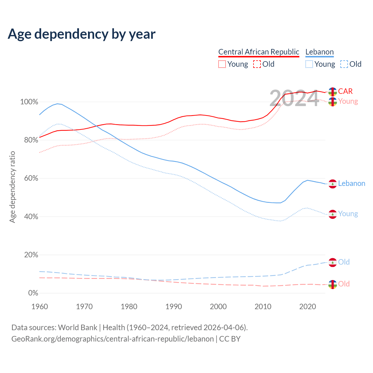 - The share of old-age demographic (65+) in the Central African Republic is 2.15% vs 10.1% in Lebanon.