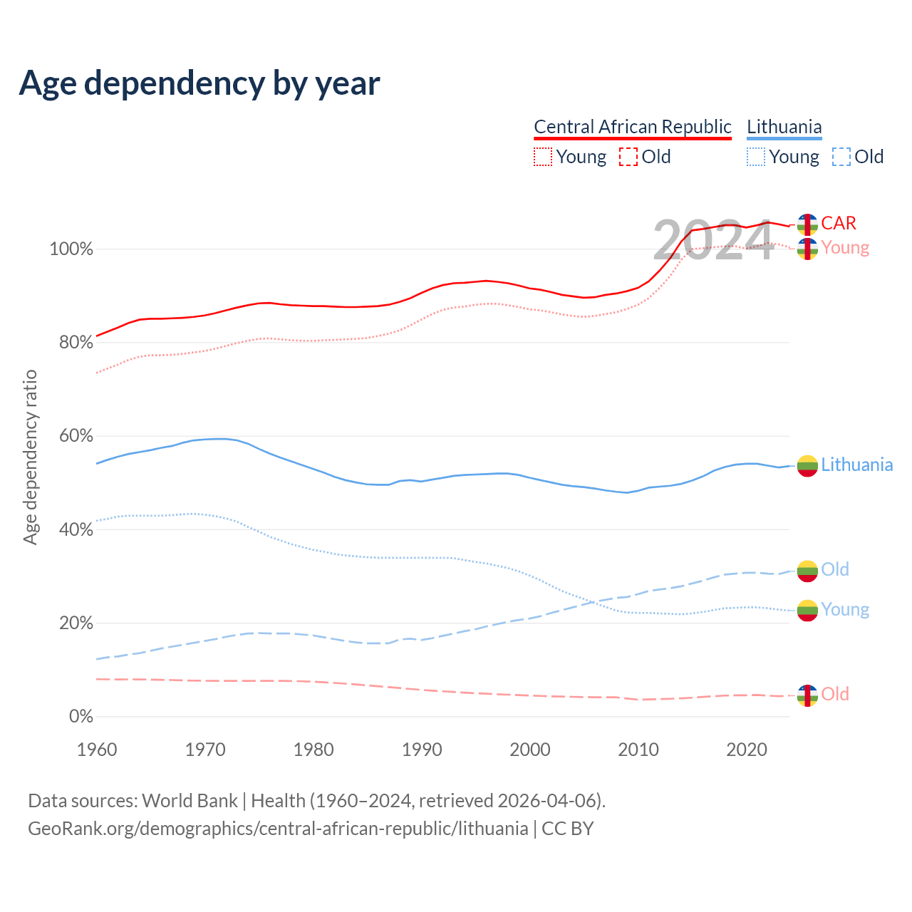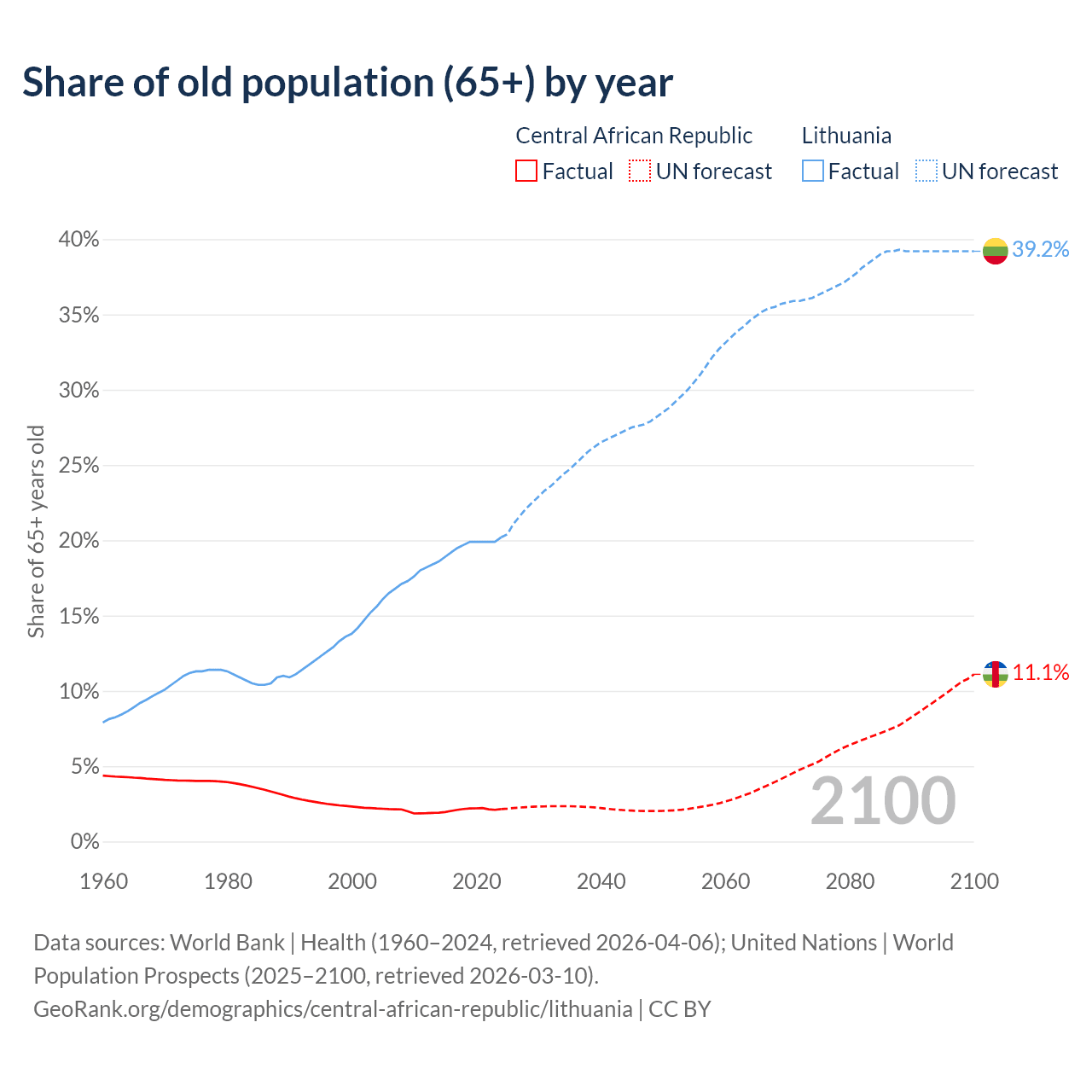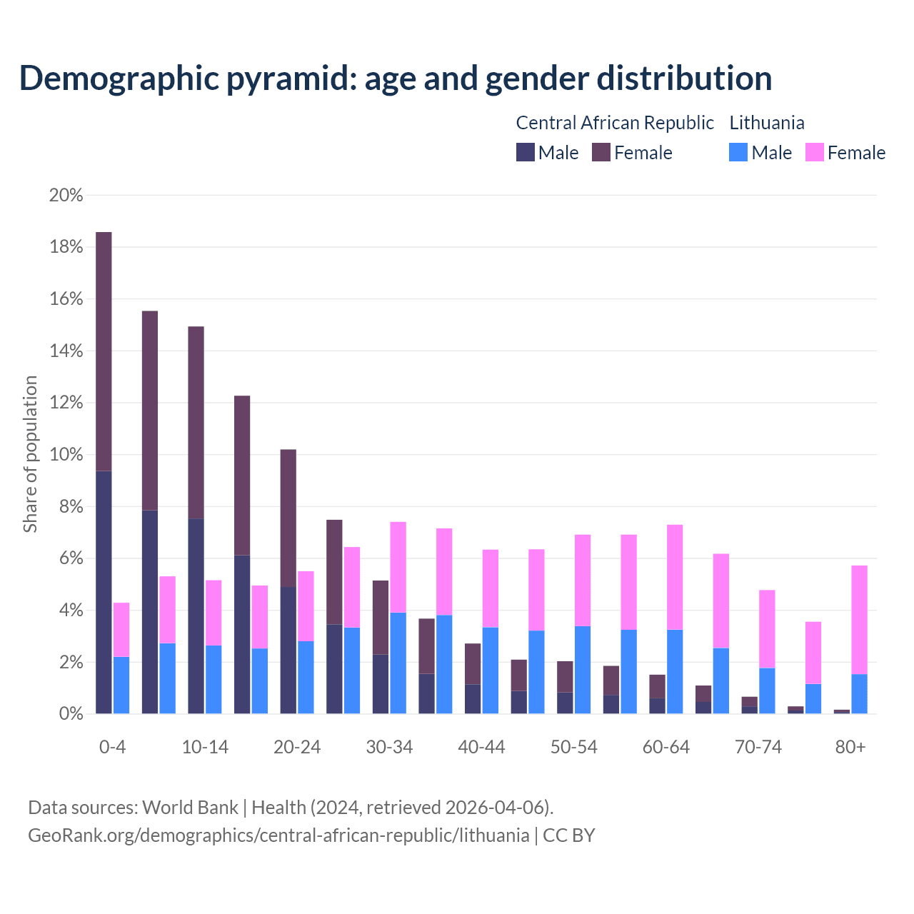 - The share of old-age demographic (65+) in the Central African Republic is 2.15% vs 20.2% in Lithuania.