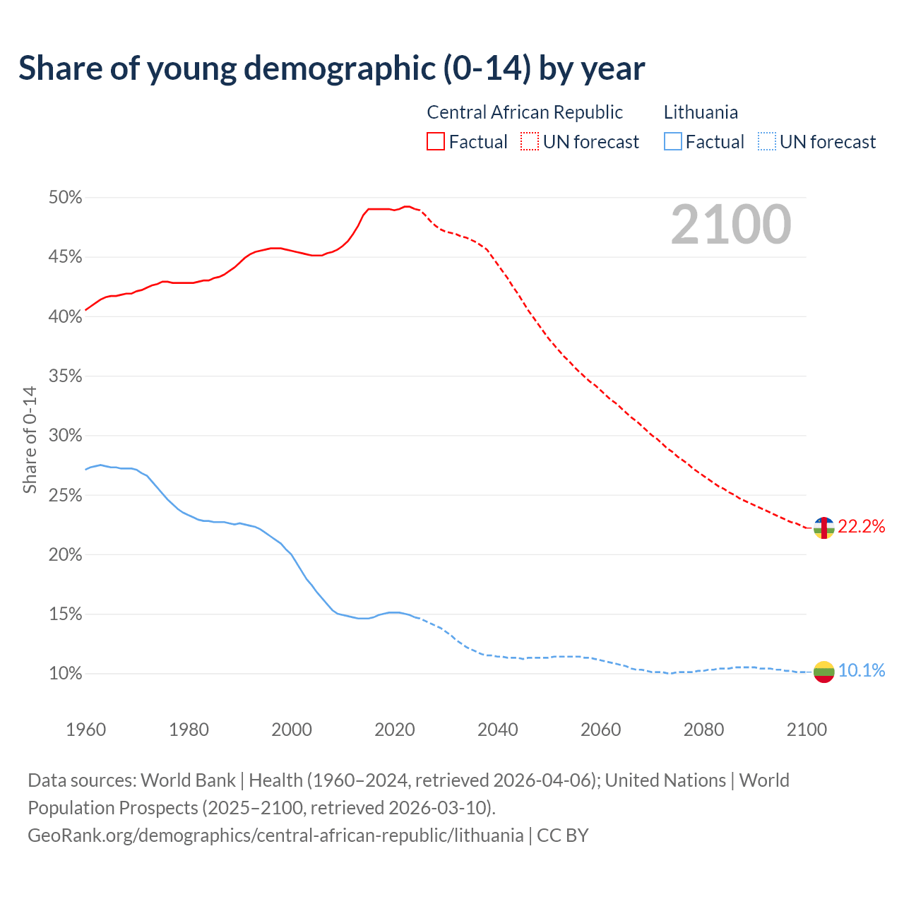 - The share of young demographic (0-15 years old) in the Central African Republic is 49% vs 14.7% in Lithuania.