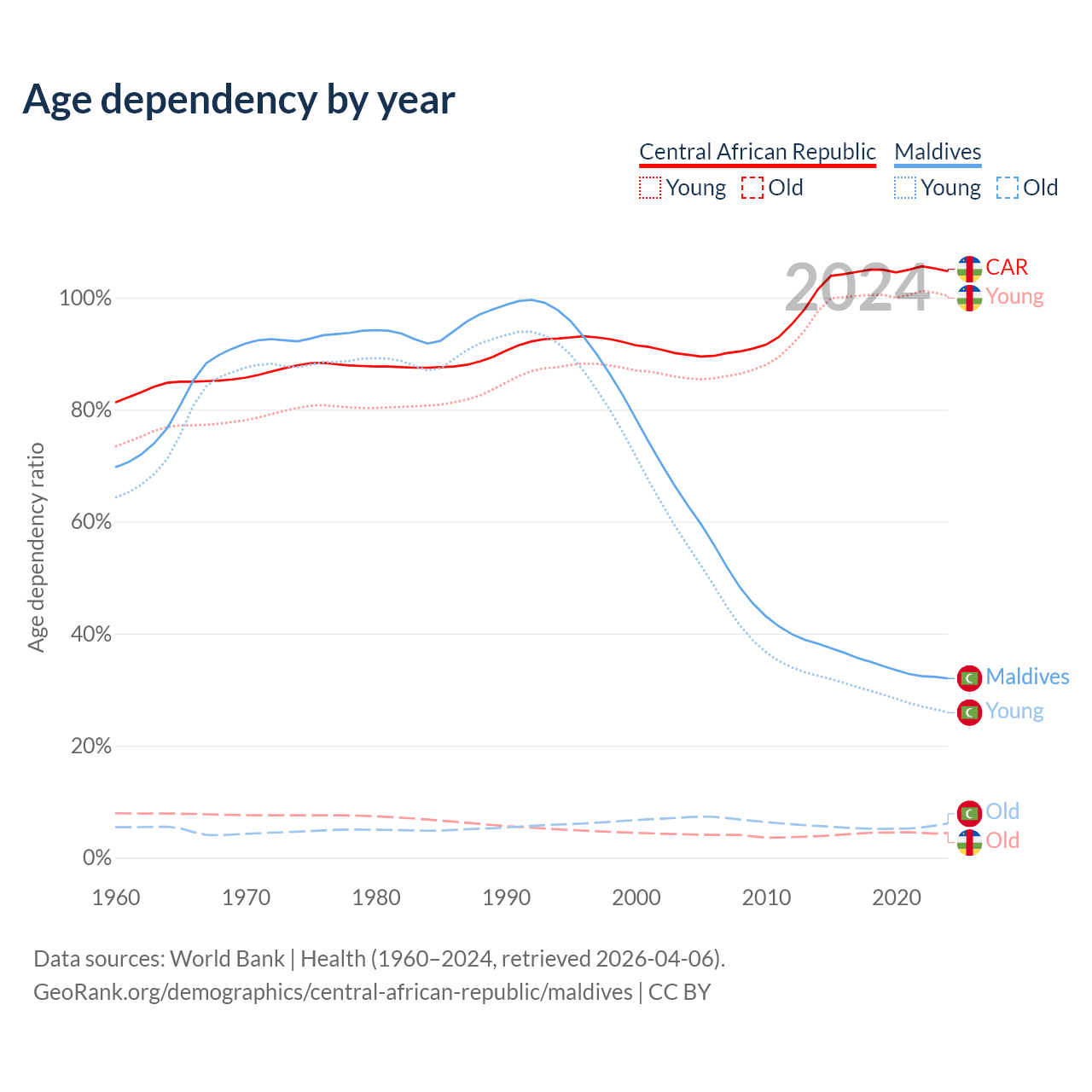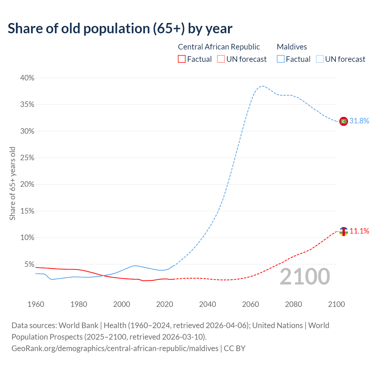 - The share of old-age demographic (65+) in the Central African Republic is 2.15% vs 4.64% in Maldives.