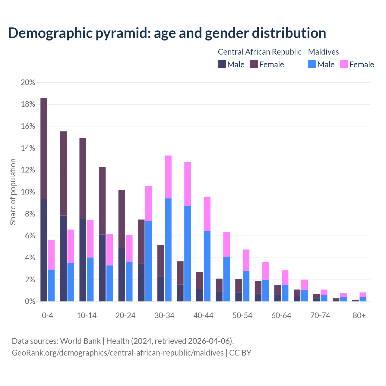 - The Central African Republic is ranked 196/196 by median age (oldest to youngest) vs 90/196 for Maldives.